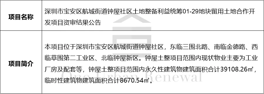 深圳市宝安区航城街道钟屋社区土地整备利益统筹01-29地块留用土地合作开发项目资审结果公告