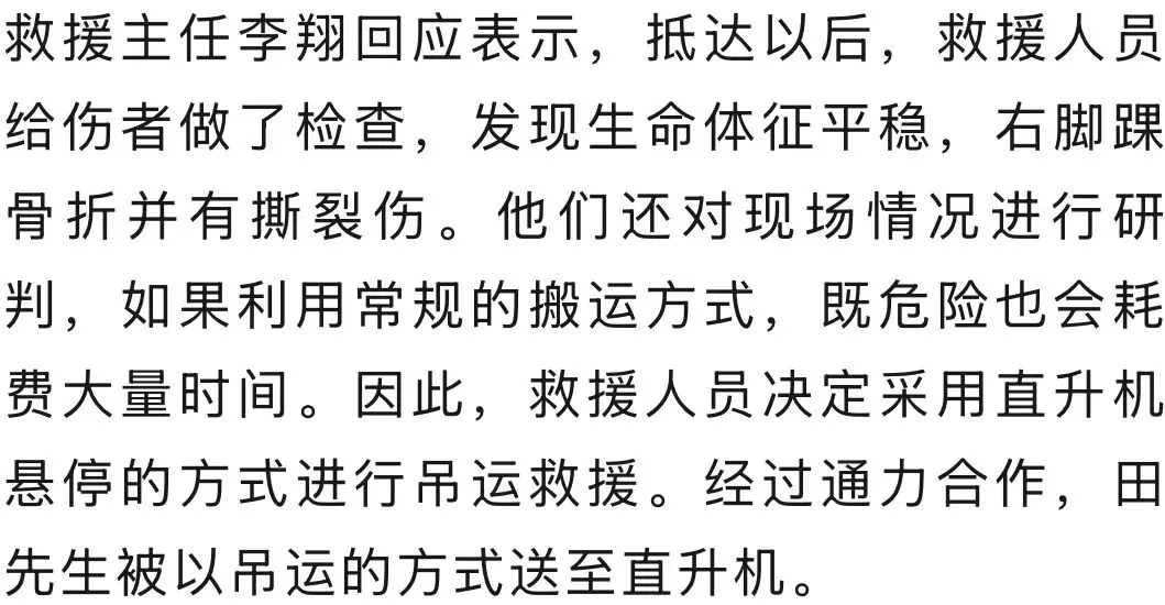 接到报警求助后,救援人员立刻前往。早上8时02分,直升飞机起飞,并于8时22分抵达现场。