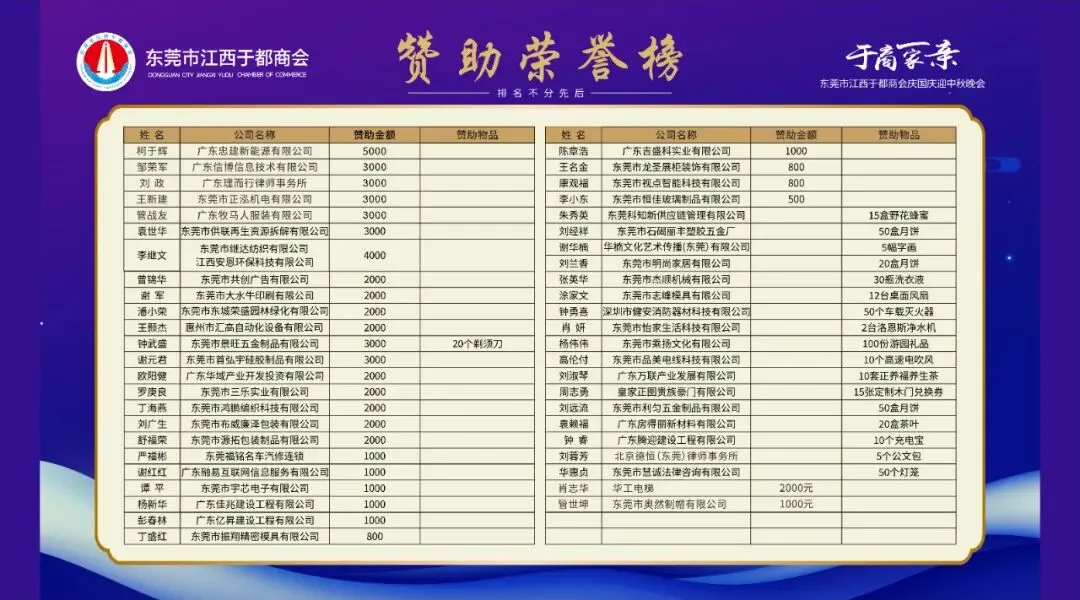 本次晚会参加人员有:会长柯于辉,第1-3届会长刘嘉,荣誉会长肖志华、陈景红,党支部书记、执行会长邹荣军,监事长刘政,执行会长王新建、管战友、袁世华,李继文,名誉会长肖忆华、钟华、欧阳健,常务副会长兼秘书长曾锦华,常务副会长丁海燕、罗庚良、管世坤、刘远流、袁赖福、谢军(中心区区长)、钟武盛、潘小荣、朱秀英、高伦付、王颢杰、刘淑琴、陈文锋、刘禾生(西区区长)、沈树生、肖延华、谢元君、郭永辉(智造委主任)、陈建荣(东区区长),顾问杨新华,党建指导员刘蓉芳,副会长刘广生(北区区长)、谢新华(服装委主任)、钟睿(青企委主任)、邱若兰(妇联主任)、段依林(志愿者服务队队长)、王名金(文体委主任)、王木森(法税委主任)、彭晓军(商学院副院长),商会副会长、理事、会员及家属共计650余位于都乡贤齐聚一堂,以月为媒,以情为桥,在欢声笑语中共叙乡情,在同心共鸣中共话未来 。