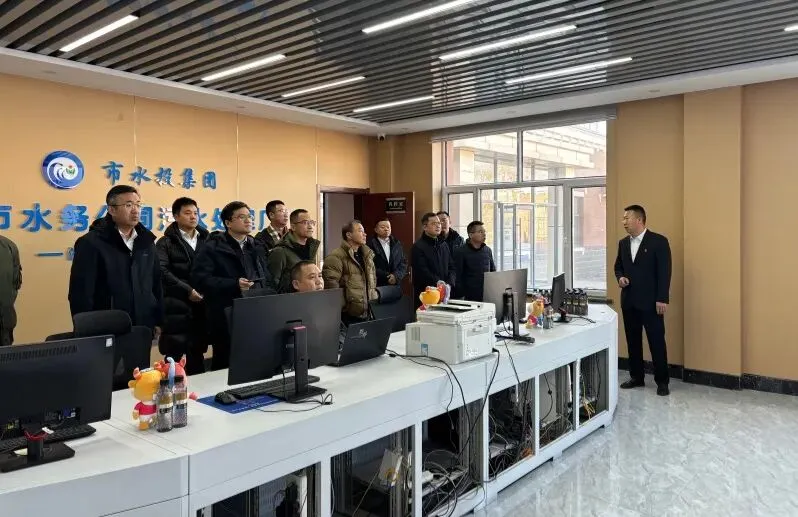 随后,调研组一行前往城市水务公司污水处理厂实地考察。在污水处理厂程控室,工作人员全面汇报了污水处理运营管理机制、核心工艺流程、全流程成本管控措施、关键技术创新突破及环境效益、社会效益等方面的成果。双方就中水回用、污泥无害化处置及资源化利用等问题进行探讨交流。调研过程中,调研组还深入污水处理生产一线,实地察看生化处理段、氧化沟等关键工艺环节的运行情况。