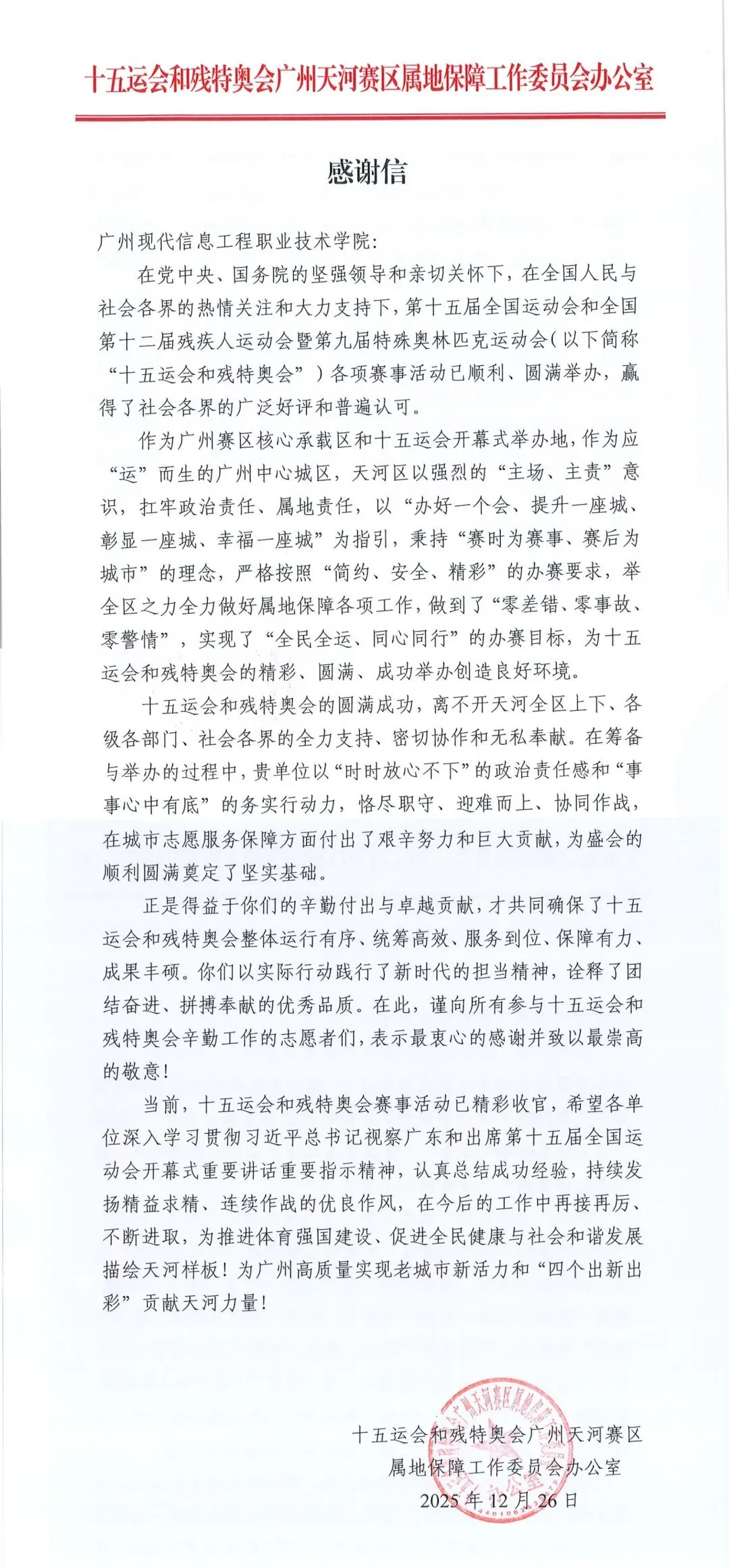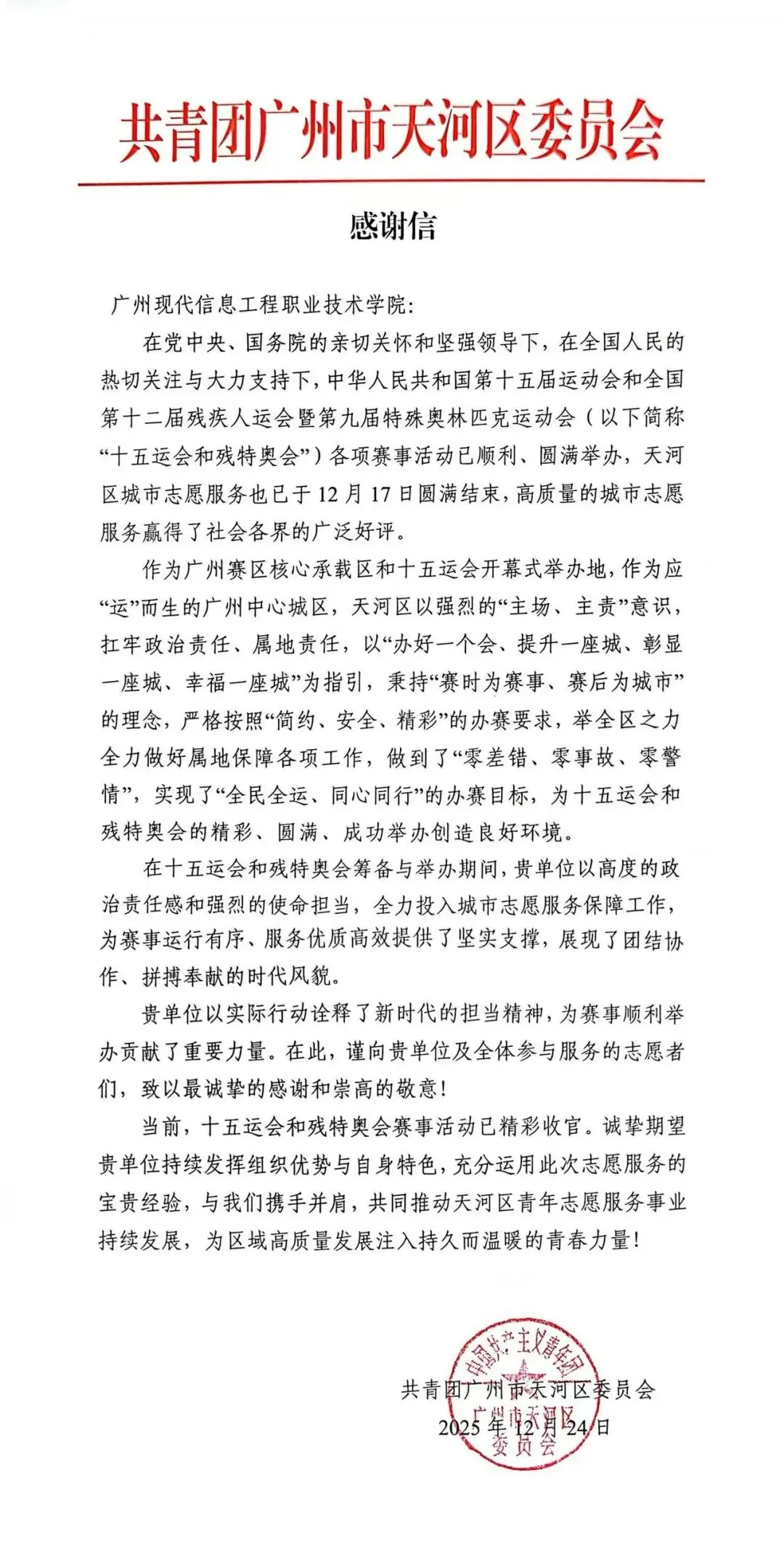 作为广东奥体中心附近的高校之一,学校累计选派469名青年志愿者参与十五运会和残特奥会志愿服务。为确保组织工作安全有序,通过采取“带队老师+组长负责人”的双保险制,实行“大组长-小组长-志愿者”三级管理体系。选派部分党务干部、校院两级教师团干部担任带队老师,精心选拔志愿服务骨干,为同学们保驾护航。广现小海豚用真诚的微笑、细致的服务,赢得了赛事组委会、参赛人员和社会各界的高度赞誉,分别收获了来自共青团广州市天河区委员会、十五运会和残特奥会广州天河赛区属地保障工作委员会办公室的感谢信,来信高度赞扬了学校的志愿服务工作,充分展现了学校青年学子胸怀家国、勇于担当的精神风貌,为盛会的成功举办贡献了青春力量,为学校赢得了荣誉!
