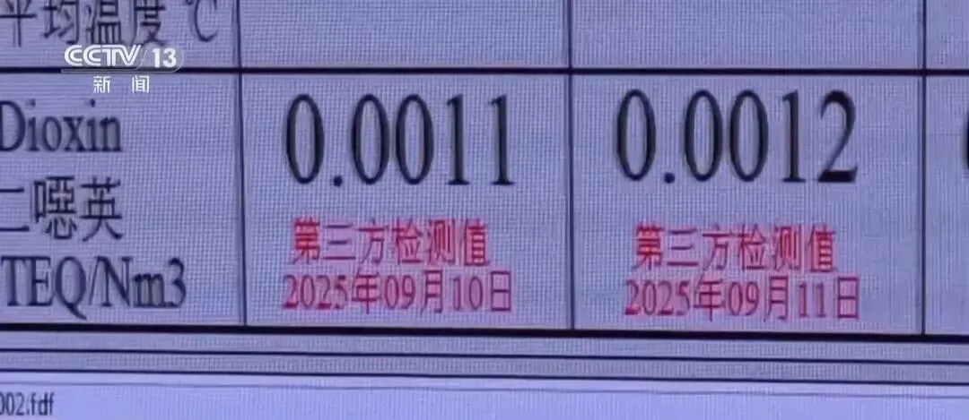 在中控室的大屏幕上看到,二噁英的国家排放标准是0.1纳克每立方米,而6个焚烧炉的二噁英排放数据,最高也没超过0.004,远低于国家排放标准。