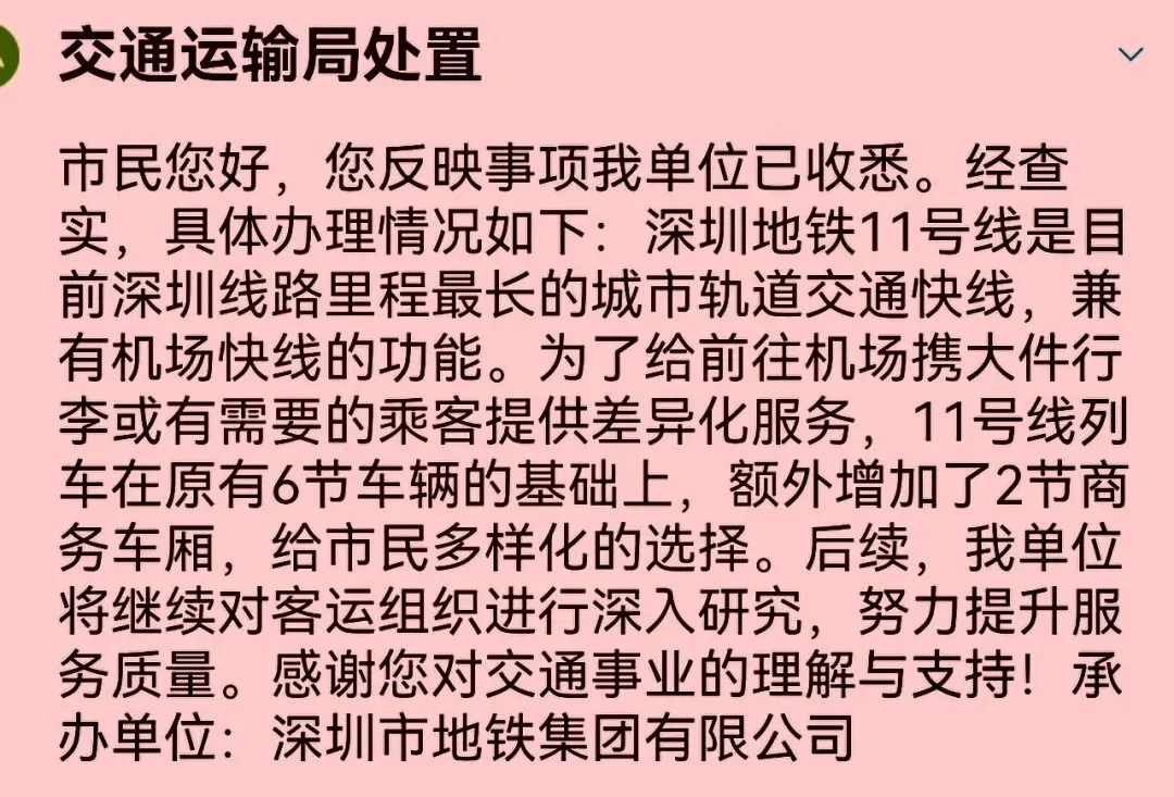 11号线是最重要的地铁线路之一,转驳的换乘站点高于城市其他的地铁线路,其中一个主要的功能是将进出深圳机场的客源快速便捷地引流集散。2025年深圳机场集疏运旅客流量达到6600万人次。十年前,深圳地铁决策者开通11号线“机场快线”,在工可研报告上,认为会有大量的高端商务客源,于是,批准同意11号线加设2节商务车厢,满足市场差异化定位。不料,“闭门造车”的实践检验是,市场并不认同深圳地铁对运营的预测和定位。地铁运输本就是一个平民化的大众出行运载工具,即便市民有过剩的消费能力,也不会像远程飞机那样去享受短暂的“头等舱、商务舱”。深圳地铁长期为自己辩解业务:增设的2节商务车厢并没有挤占正常的6节车厢;商务车厢可以通过高票价弥补运营成本;满足11号线途经市区会展中心等商务人员出行;孕妇、老人出行有需求;携带大件行李去机场的旅客有需求......深圳地铁忽略了自己对各站出入口上、下功能设置的了解;忽略了对城市发达便捷的网约车可以点到点服务;忽略了机场来往携带大件行李的旅客还要通过繁琐的安检;忽略了老人、孕妇根本不适应迈下深深的台阶;忽略了11号线资源严重浪费和乘客舒适度的不好体验;忽略了官员富豪机场迎来送往出行是很少乘坐地铁的......深圳地铁的“商务车厢”模式骑虎难下,既成事实后,据说如果再要调整改变线路功能,取消商务车厢,还要再一轮形成工可研究、报告审议、修改规划、方案论证,然后再进行项目评审、审核、审批......于是,多一事不如少一事,过一天算一天躺平。深圳地铁不再愿意直视面临的问题,对建议、批评是虚心接受,坚决不改。既不敢深入乘客做调研走访,拿出切实可行的改进之策,也不敢公开11号线的真实业务数据,做出对比修正的意见。深圳地铁本属普惠性的公共交通服务设施,却筑起了我行我素任性管理的保护膜,一方面享受着政府财政补贴扶持,一方面无视国有资产运行的低下效率。在市区一段短暂的出行路上,乘客还要被分成三六九等。深圳地铁有个观点,2节车厢好像是不用花钱额外加上去的,并没有挤占到应有的6节车厢资源。似乎在11号线上,地铁运营已经尽心尽力了,大家不应该总是盯着商务车厢不放。为了粉饰不足,指望增加地铁商务车厢高票价运营收益,深圳地铁专门在11号线各站点加设了人工二次验票流程、隔离围栏,有的站内设站,为商务车厢安装了二次验票的闸机核准设备。但事实上,市场对商务车厢还是普遍不加认可。深圳地铁在使用商务车厢的收益贡献,可能远远不足以覆盖自己对地铁站点再投入的二次新成本增加。深圳地铁一直辩称商务车厢为老人、孕妇提供服务,你见到过几次乘客会把自己家里的老人,或身怀重孕的妻子塞进地铁去机场的。换位思考,如果是你,你是选择网约车,还是会钻进地铁里的商务车厢?对于携带大件行李的乘客,深圳地铁一直抱有乘坐商务车厢的不切实际想法,这是需要有何等的智商和心理素质,才能说服自己啊!国有资产属于全民所有性质。政府公共性资源和国企公共产品服务应立足民生的需求,他们有责任、有担当构建社会和谐平等普惠,消除资源产出效率低下、管理不善浪费、挤占分享不公,甚至是人为制造贫富距离的现象。民生无小事,枝叶总关情。深圳民意速办总能用这句最好听的安慰语言,把深圳地铁的商务车厢遮挡得严严实实,最后让你不了了之。有人说,解决内部存在的问题,往往还是需要靠外力来推动突破。深圳地铁不仅对取消商务车厢毫无进展,最近还推出了新的业务举措,在11号线上又增设了2节货运车厢。那么,这次11号线路的运营功能调整流程又是如何顺利办成,并付诸实施的呢!深圳地铁这种专业定位不清、服务市场模糊、管理认知不上心的做派,已经到了非要改一改的时候了。