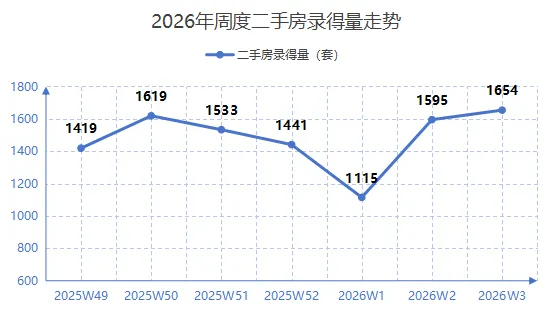 二手房市场同样保持升温,深圳市房地产中介协会统计显示第3周全市二手房录得量达1654套,环比增长3.7%,连续多周稳步上升并重新站上1600套水平。