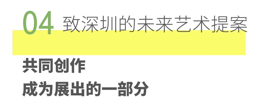 四个单元的展厅中均设有互动共创装置,将交由每一个来到现场的观众共同思考、动手、创作,成为展览的一部分。我们以期通过这种形式,在与青年艺术家们创作对话的当下,让属于深圳的、在地的、未来的可能性就此生发。