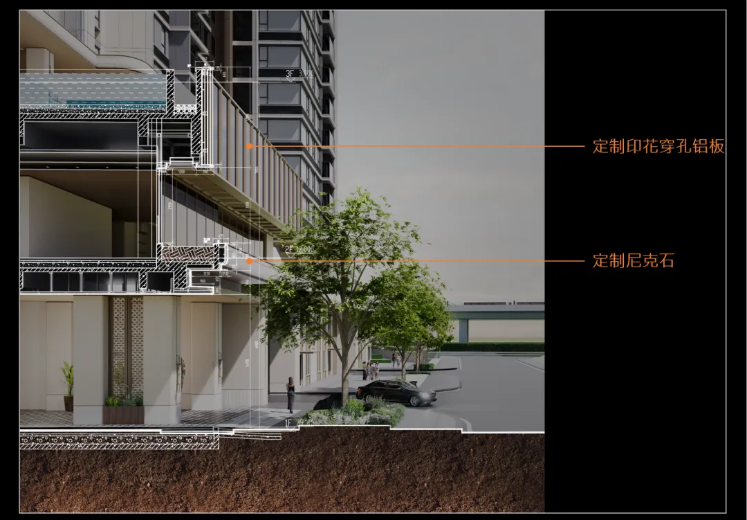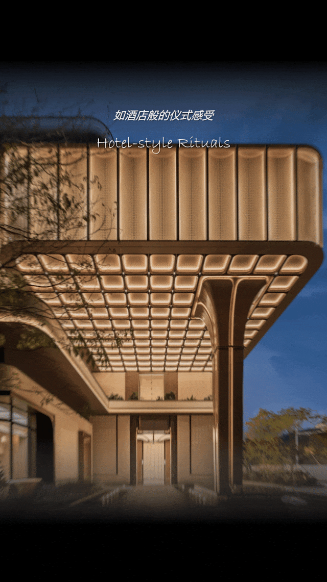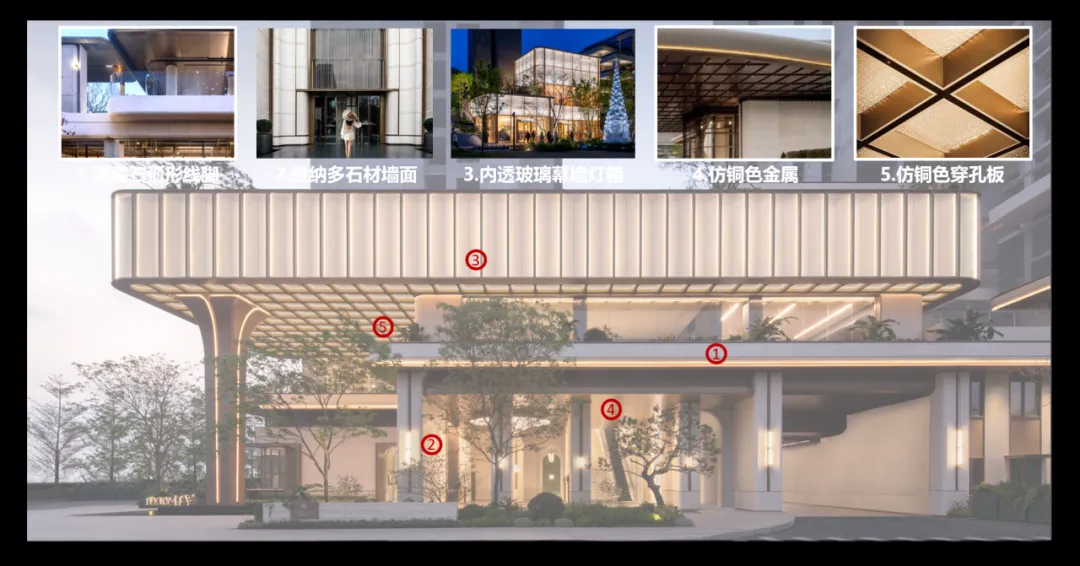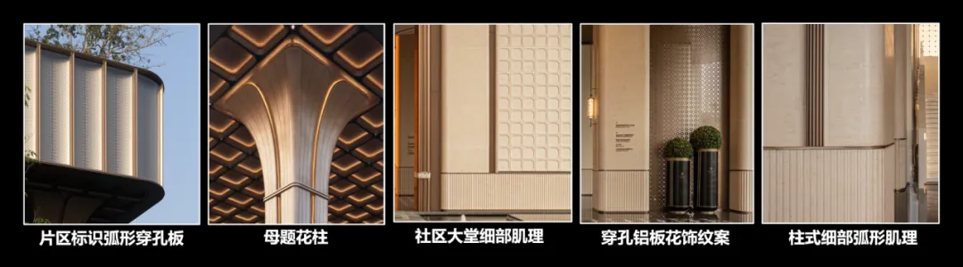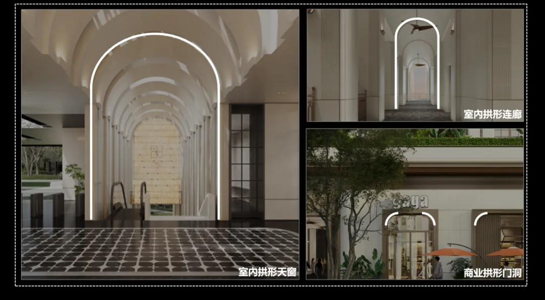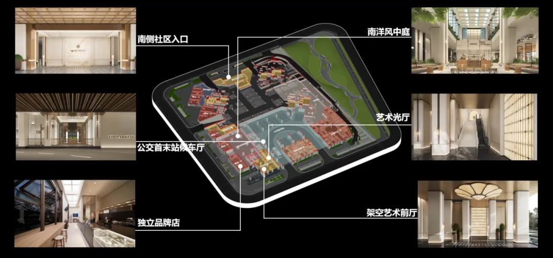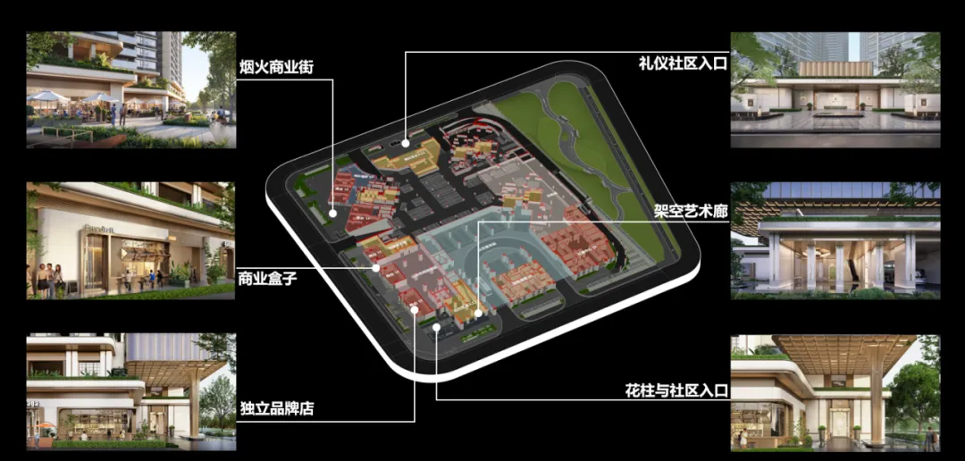 北侧作为核心展示区和公交首末站,是超级底盘的核心区域,结合其设计昭示性,我们将社区北入口以轻松高雅的方式与其相结合,不同的动线在此汇聚疏导;东侧是大区主要商业配套空间,街道设计丰富的外摆空间;南侧整体界面作为大区酒店式豪华落客空间,为未来归家提供尊贵和礼仪感。