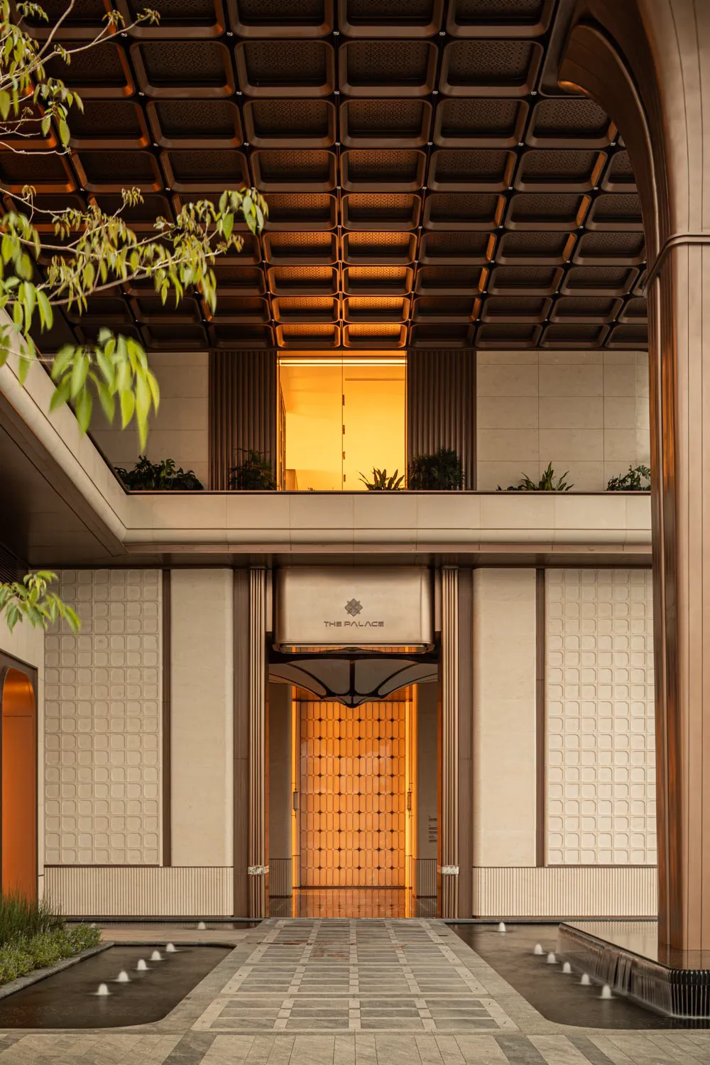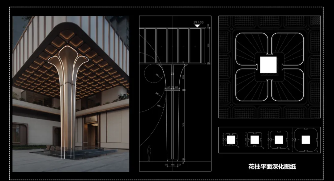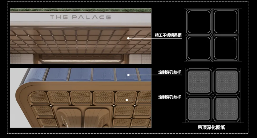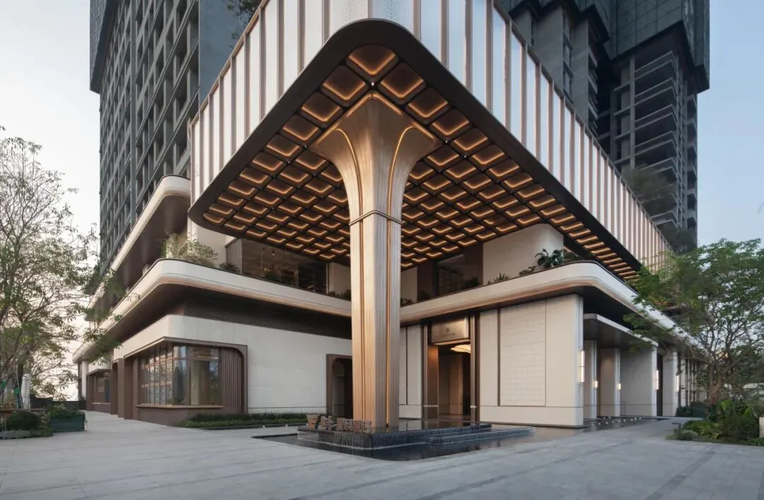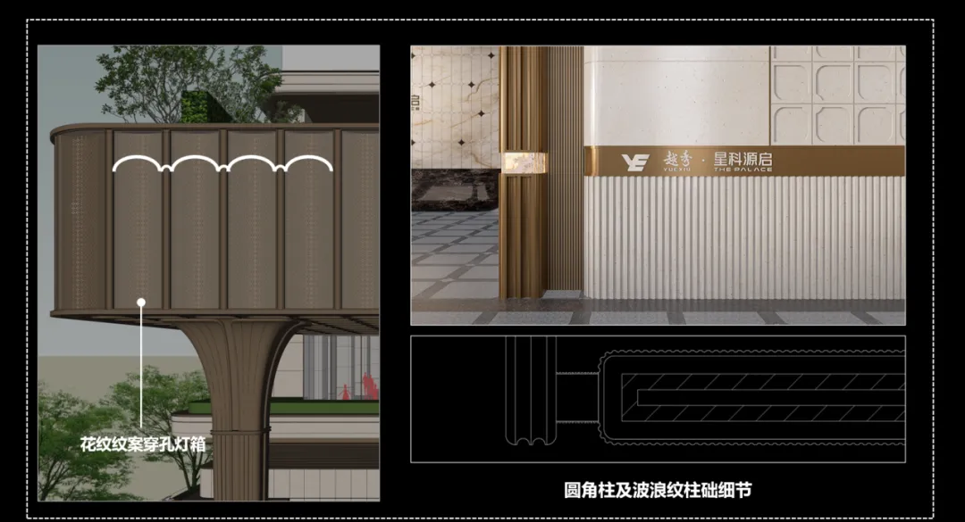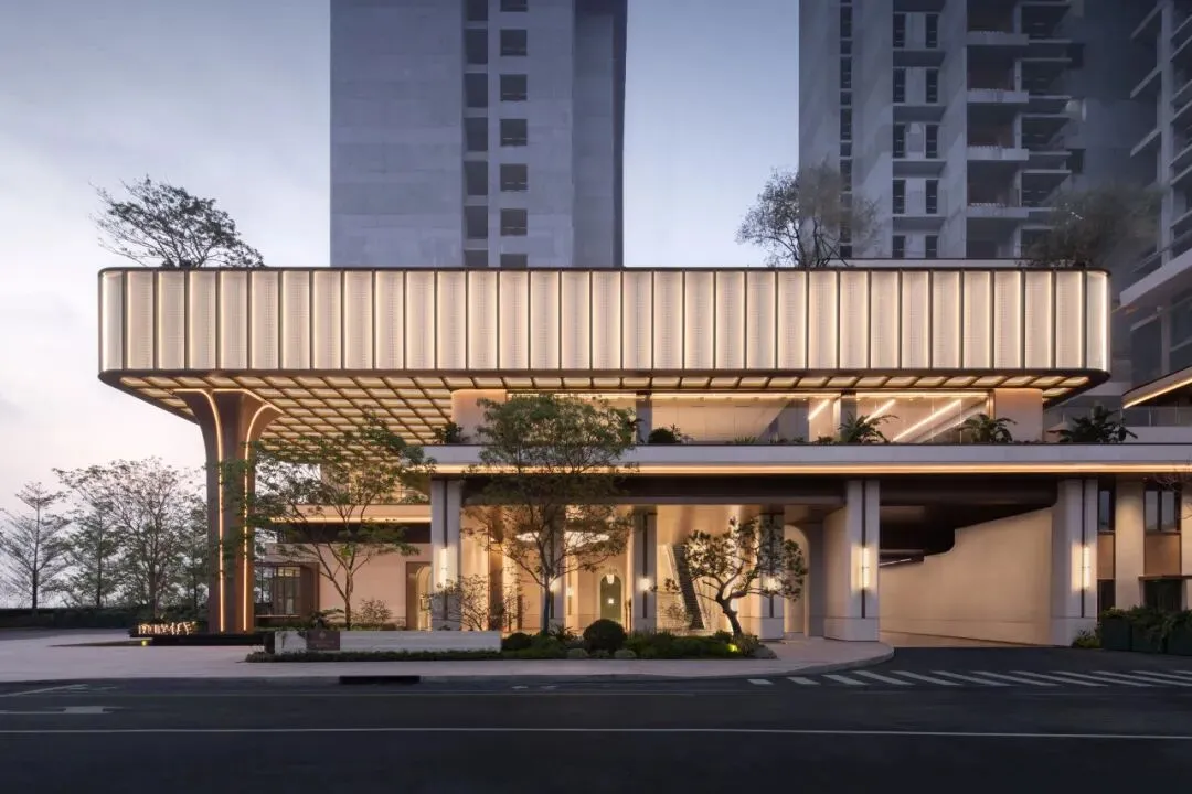 北侧作为核心展示区和公交首末站,是超级底盘的核心区域,结合其设计昭示性,我们将社区北入口以轻松高雅的方式与其相结合,不同的动线在此汇聚疏导;东侧是大区主要商业配套空间,街道设计丰富的外摆空间;南侧整体界面作为大区酒店式豪华落客空间,为未来归家提供尊贵和礼仪感。