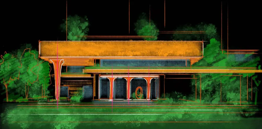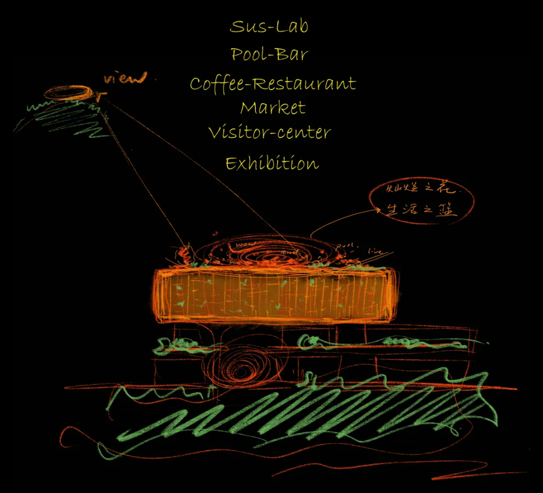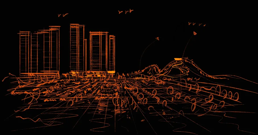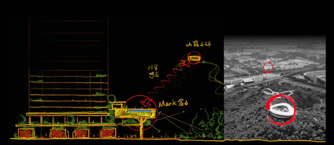 地块西北侧临近深圳光明区科技公园,公园顶部是当地旅游地标“天空之镜”,整体犹如“宇宙飞船”盘旋于公园的制高点——光明顶。本案通过多层架空,抬高核心体量与其遥相呼应,形成对话关系。