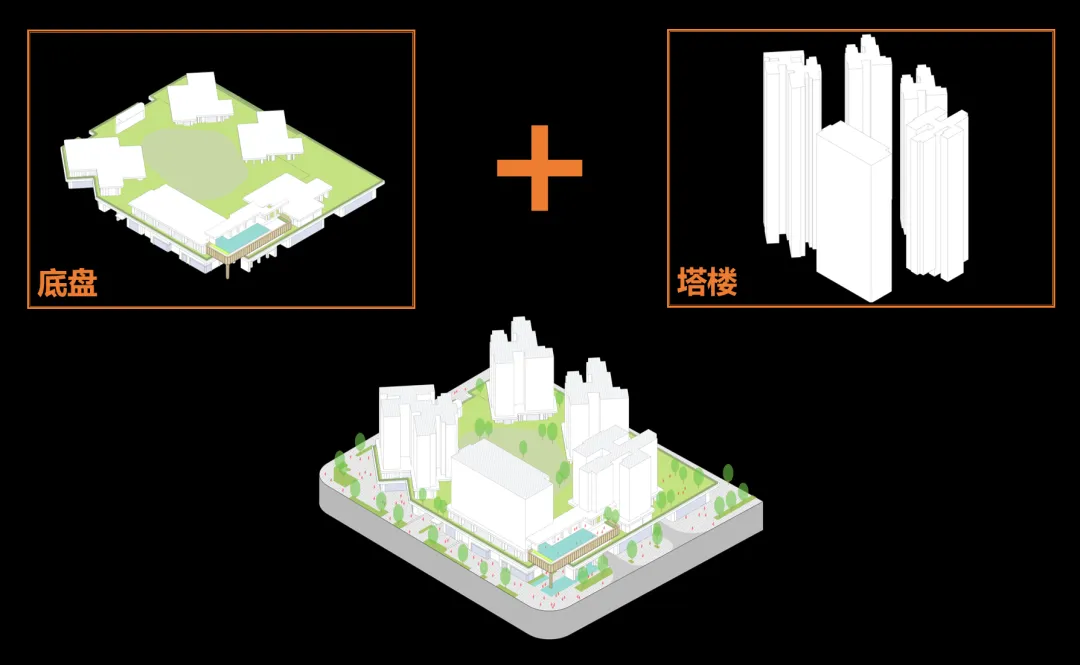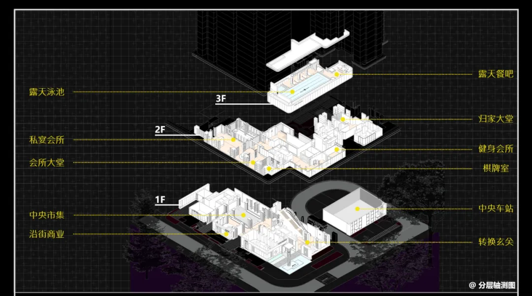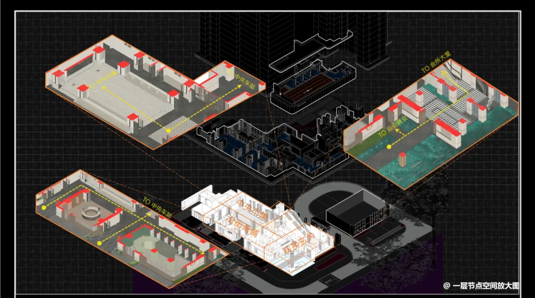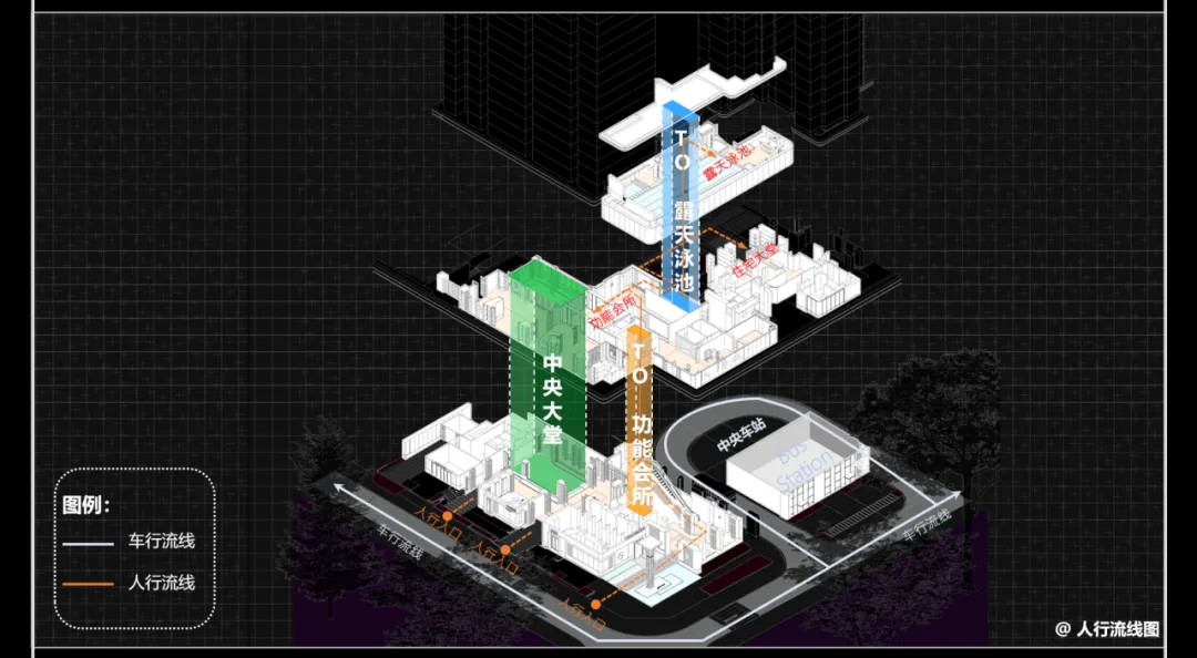 超级底盘首层作为与城市直接关联的标高层,其重要性不言而喻。所以为了满足其公共属性的同时又服务于大区,我们提出“城市综合体”概念。将大区主要示范区域与地块内公交首末站设计融合,结合商业体量和架空空间,对其功能和流线系统进行梳理,创造一个既“开放有机”又“合理便捷”的迷你TOD空间。
