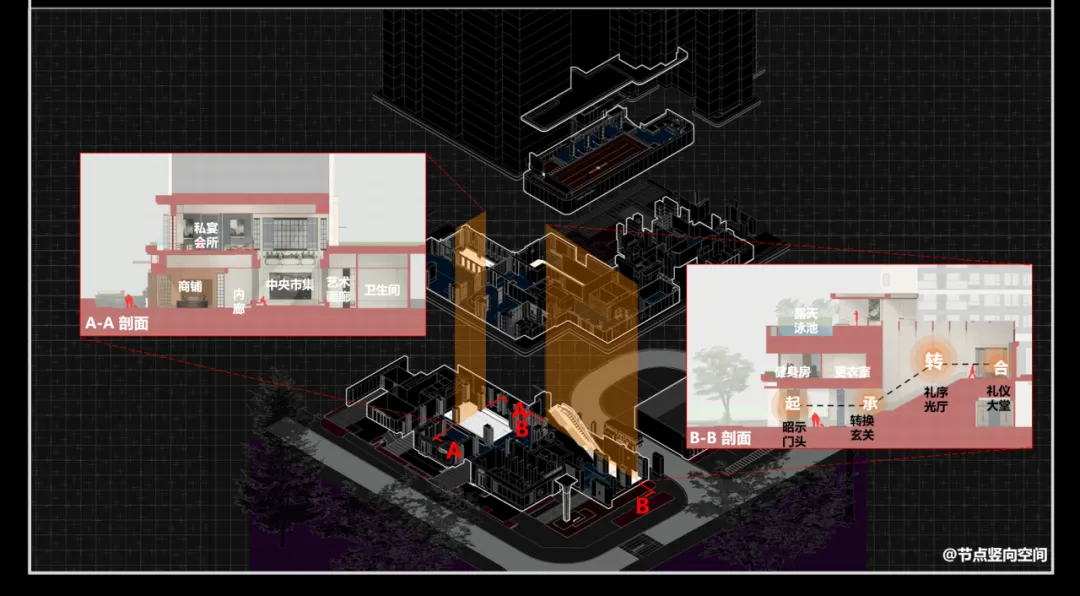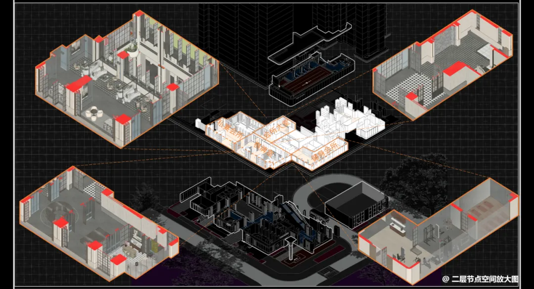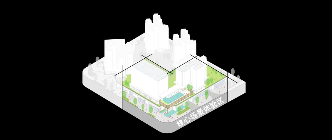 核心展示区平面功能及动线都较为复杂,需要解决不同人流动线汇聚和客群需求上的差异化,为此我们多次尝试不同的平面设计方案:商业以小型体量的形式散布在核心区域首层,双面开铺的形式服务城市和架空界面,在不遮挡公交站流线的基础上,以最小的面积满足整体的商业赋能;公交站的流线主要集中在北侧,同时架空层也预留了乘车动线,以吸引人流提高商业价值;大区归家动线借用核心街角广场提升归家体验,同时以架空柱廊形式来呼应大区气质,并且规避掉商业和社区入口气质不符的问题。