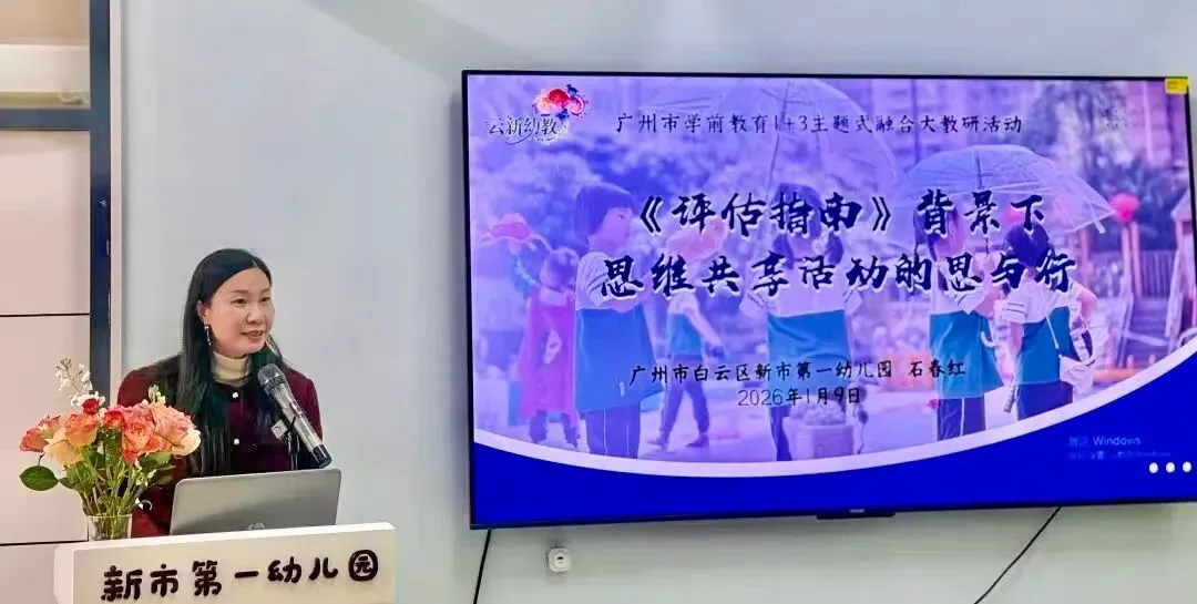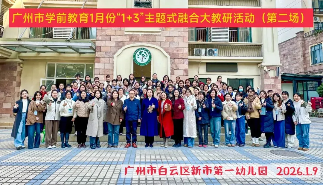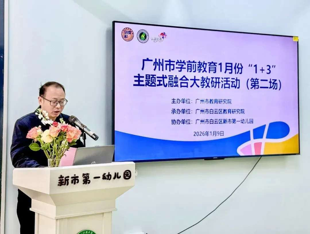 2026年1月8日-9日,由广州市教育研究院主办、白云区教育研究院承办的广州市学前教育2026年1月份“1+3”主题式融合大教研活动在白云区金沙第三幼儿园(第一场)和白云区新市第一幼儿园(第二场)圆满举办,本次系列活动以“促进幼儿思维共享的集体教学活动设计与组织”为主题。广州市教育研究院教研员林岚老师,白云区教育研究院李春明副院长、新市教育指导中心李春玲主任、区教研院学前部刘洪玉部长、教研员吴楚琼、教研员王笠入出席活动,吸引了广州市各区学前教育教研员、特约教研员代表、广州市各区幼儿园园长及教师代表等共计160余人参与。