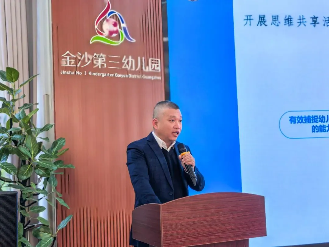 金沙第三幼儿园黄海生园长作了题为《从游戏到成长:幼儿游戏思维共享活动的实践与思考》的主题分享,既提到AI时代背景下,园所探索“游戏+表征+一对一倾听+思维共享”的实践路径,也分享了开展思维共享,层层解困的具体策略。