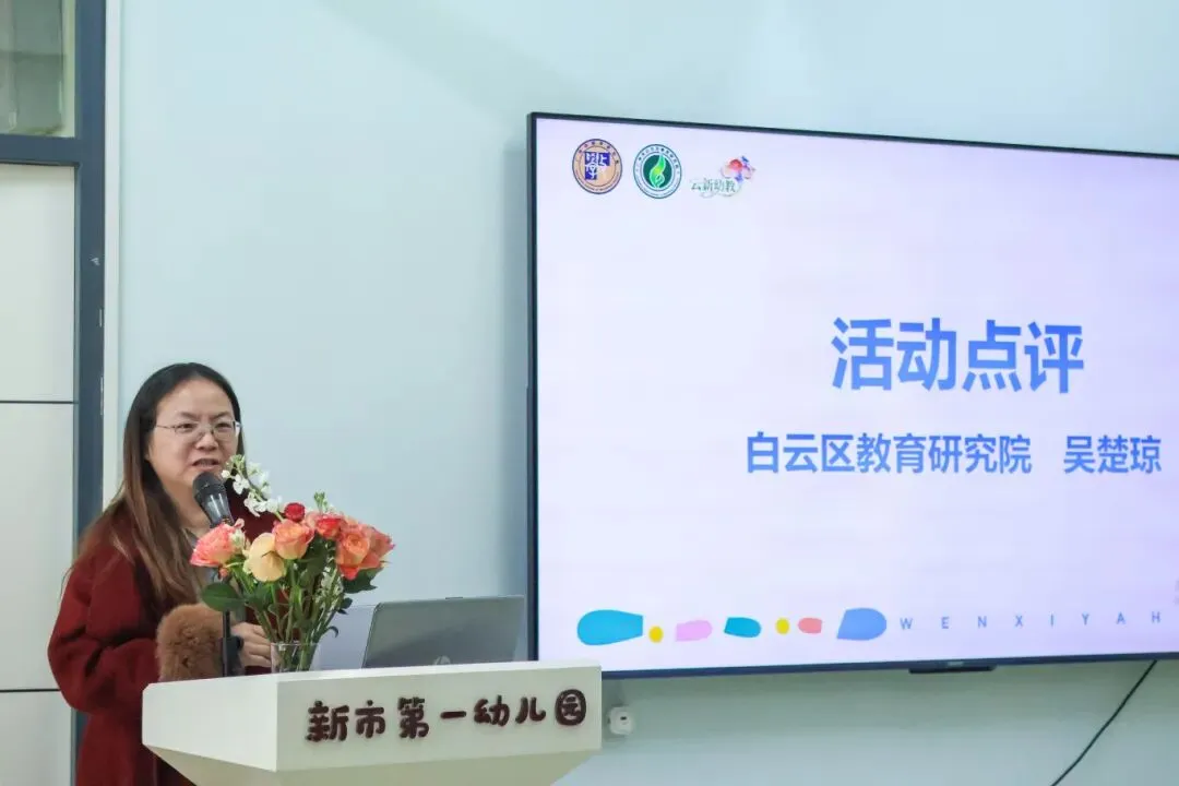 第二场活动在新市第一幼儿园举行,白云区教育研究院教研员吴楚琼老师对幼儿园在思维共享活动中的系统思考与实践成果表示赞扬,肯定了“教师提问的精准性、共享话题的延续性、幼儿思维的可见性”等方面的积极探索和显著成效,并就后续深化实践提出具体建议,为幼儿园后续开展思维共享活动指明了更具操作性的提升路径。