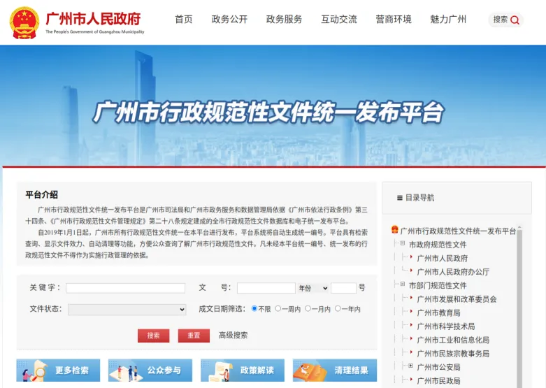2025年,广州市行政规范性文件统一发布平台(下称“发布平台”,网址:https://www.gz.gov.cn/gfxwj/)聚焦公众使用需求,新增“更多检索、公众参与、政策解读、清理结果”四大功能模块,方便企业和群众“精准获取、快速理解、深度参与”。