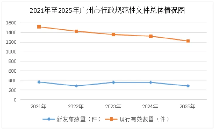 发布平台于2019年1月1日上线运行,截至2025年,已累计发布行政规范性文件6800余件,其中,2025年度新发布的行政规范性文件286件,现行有效行政规范性文件1224件,新发布行政规范性文件数量和现行有效行政规范性文件数量相比过去4年总体均呈下降趋势,体现了广州近年来对政府及部门制发行政规范性文件实行计划管理、总量控制和立项监督,严控行政规范性文件数量的举措卓有成效。