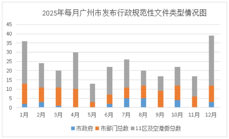 2025年,广州市行政规范性文件的发布时间,从季度上看相对集中于每季度首月,从年度上看相对集中于年头年尾;发布层级上,市政府及市部门发文数量和各区、各镇(街)及空港委发文数量配比较为均衡,全市行政规范性文件的制定发布具有较好的统筹性和协调性。
