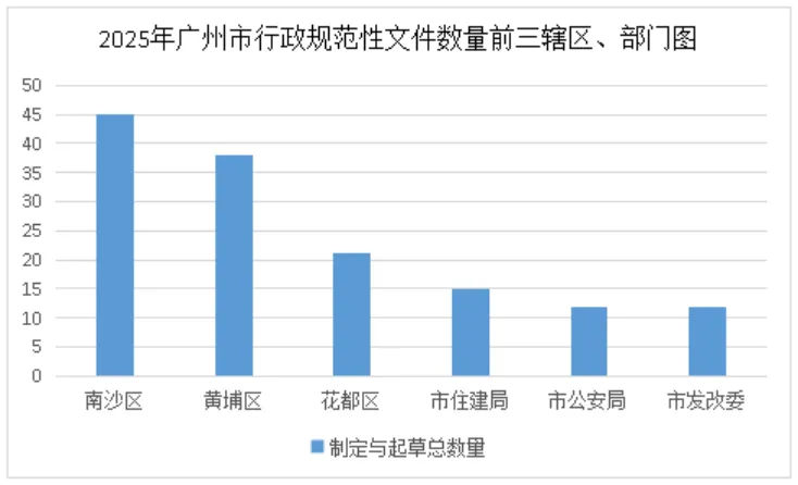 2025年,从发文数量上看,市级行政规范性文件突出社会建设与治理主题,南沙(含广州南沙开发区管委会)、黄埔(含广州开发区管委会)、花都等区以丰富的政策供给助力社会经济发展。