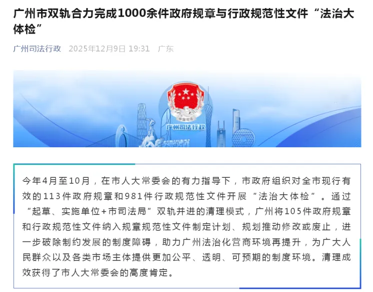 2025年,广州市组织11个区、40余个部门对全市现行有效的全部行政规范性文件开展“大起底”全面“体检”,通过拉网式排查、交互式验证,将52件因上位法更新未及时评估清理、导致存在部分条文与上位法最新规定不一致等问题的行政规范性文件列入修改或废止计划并明确完成时间节点,确保行政规范性文件与时俱进。