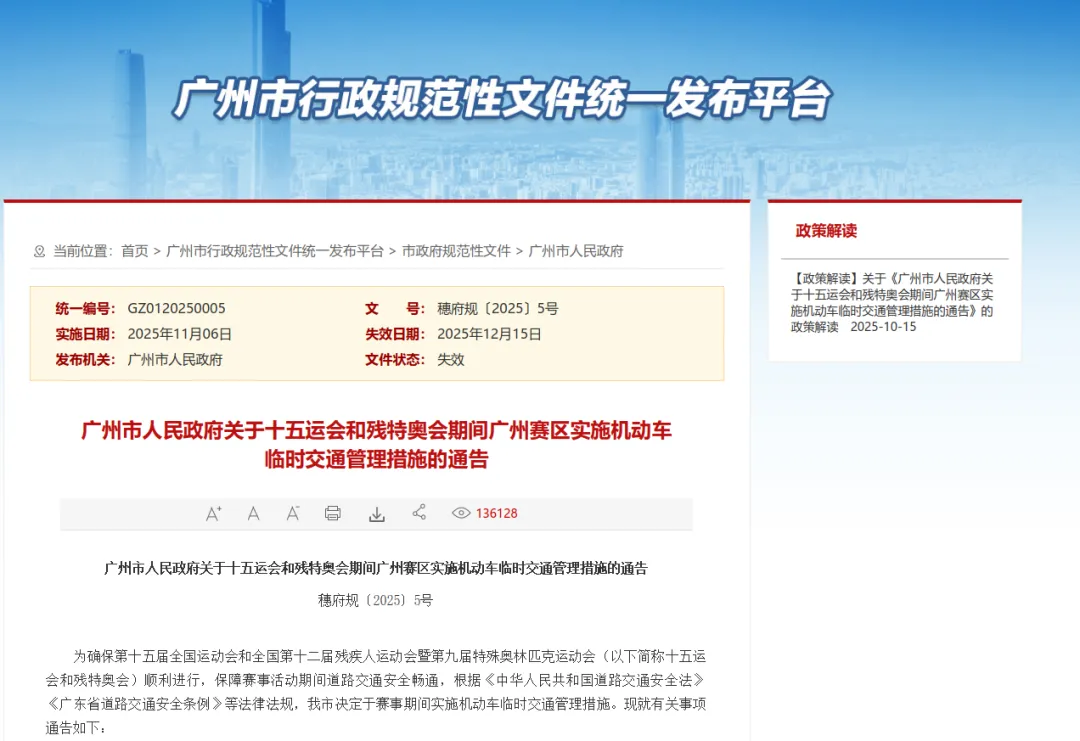 2025年发布平台最受关注的行政规范性文件是《广州市人民政府关于十五运会和残特奥会期间广州赛区实施机动车临时交通管理措施的通告》(穗府规〔2025〕5号),平台浏览量超10万人次。其他关注度较高的行政规范性文件包括《广州市发展和改革委员会关于广州市中心城区自来水价格改革有关问题的通知》(穗发改规字〔2025〕4号)、《广州市人民政府办公厅关于加强农村住宅建设管理的实施意见》(穗府办规〔2025〕11号)、《广州市人民政府办公厅关于重新发布广州市引进人才入户管理办法的通知》(穗府办规〔2025〕9号)、《广州市人民政府办公厅关于印发广州市既有住宅增设电梯办法的通知》(穗府办规〔2025〕6号)等,较为集中在民生政策领域。