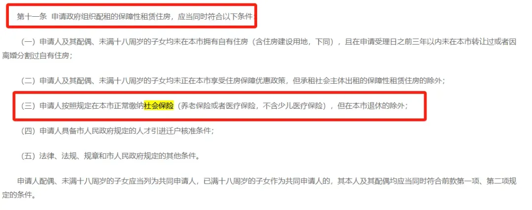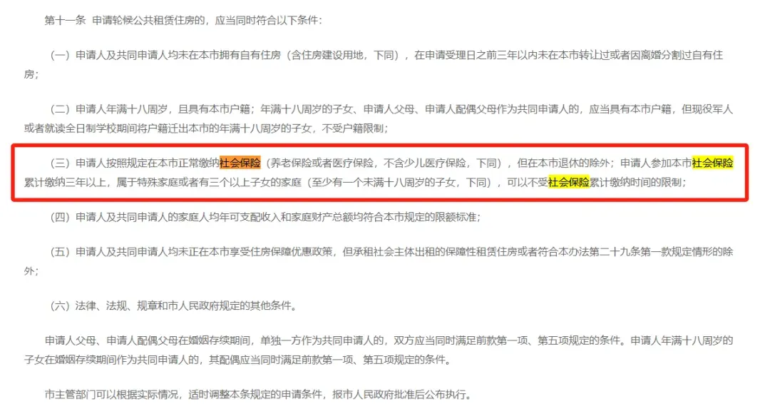 申请人按照规定在本市正常缴纳社会保险(养老保险或者医疗保险,不含少儿医疗保险),但在本市退休的除外;申请人参加本市社会保险累计缴纳三年以上,属于特殊家庭或者有三个以上子女的家庭(至少有一个未满十八周岁的子女,下同),可以不受社会保险累计缴纳时间的限制。