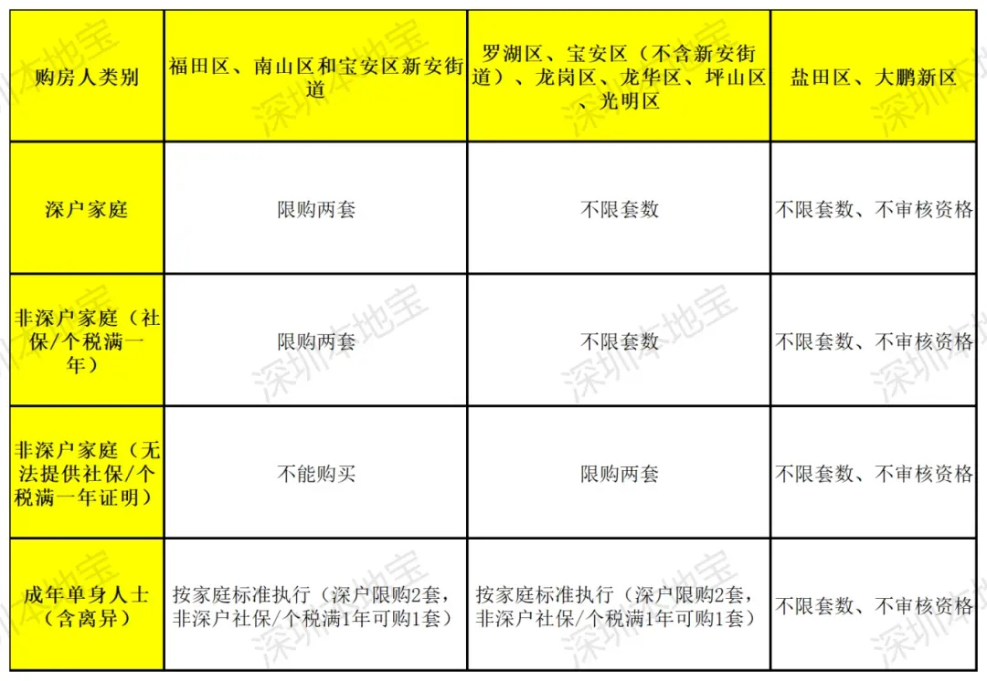 深圳户籍居民家庭限购2套、在深圳连续缴纳社会保险或个人所得税满1年及以上的非深圳户籍居民家庭限购1套。