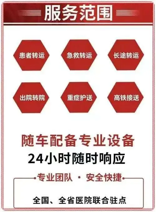 我们是救护车出租转运公司,120救护车接送病人预约护送。24小时为术后康复、危重患者及跨区域就医人群提供专业医疗转运服务,提供120救护车转运出租‖私人120救护车(非急救)‖跨省长途转运‖危重病人转运‖市内转运‖术后康复病人转运‖高铁病人转运‖患者返乡‖配备ICU设备:呼吸机▪心电监护仪▪吸痰器•微量泵•氧气▪急救药箱▪专业医护团队