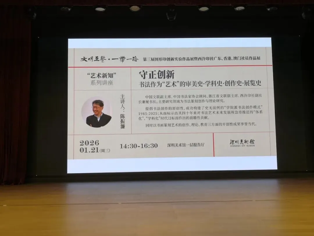 2026年1月21日下午,中国文联副主席、中国书法家协会原副主席、西泠印社副社长兼秘书长陈振濂,莅临深圳美术馆,以《守正创新——书法作为艺术的审美史·创作史·展览史》为题,作了一场精彩的专题讲座。