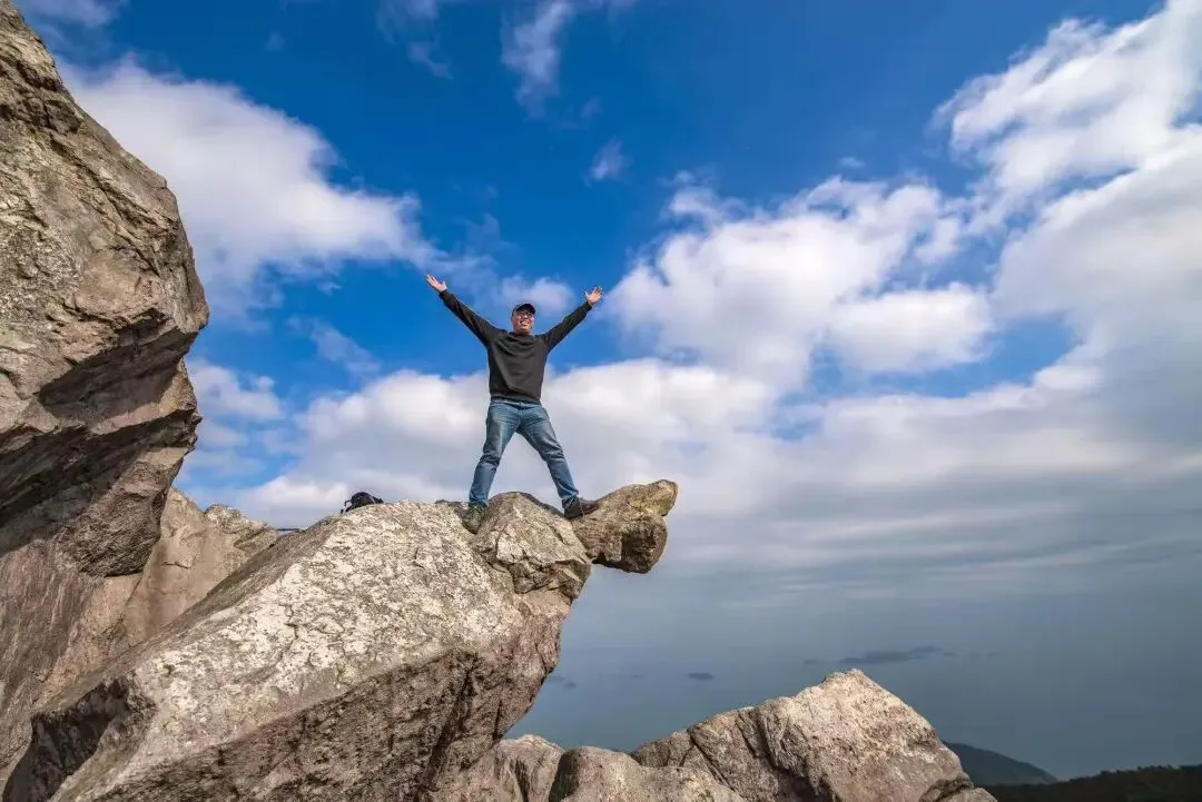 从山脊左转前行数百米,便是网红打卡点龟仙石。几块巨大的岩石天然堆叠,形似一只静卧山海间的万年神龟。
