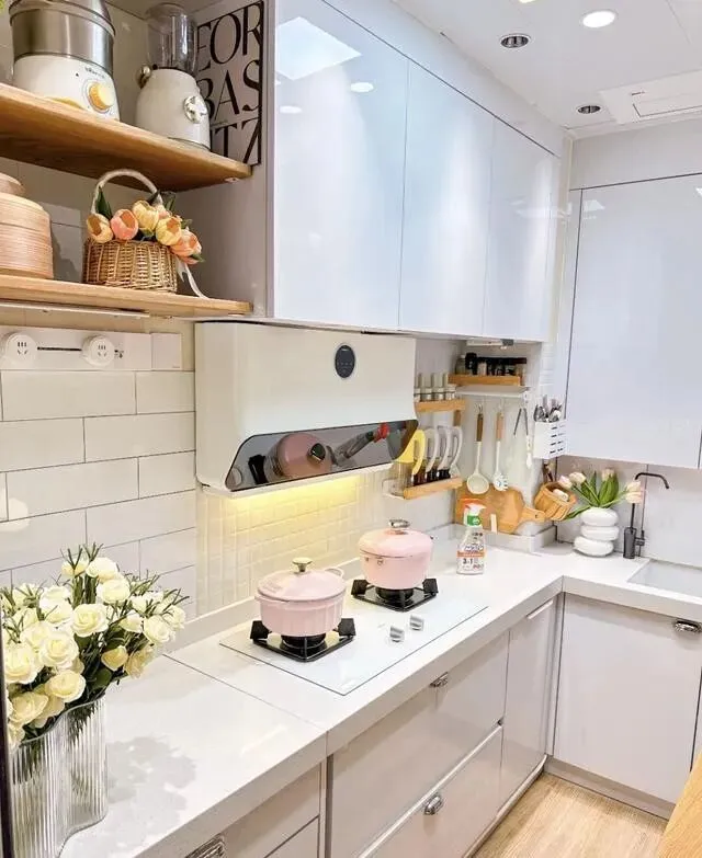 这招我觉得特别实用 , 很多人家里厨房乱 , 不是东西多 , 是颜色太杂了 , 锅是黑的 , 柜子是木色 , 电器又是银灰色 , 眼睛都不知道往哪放。