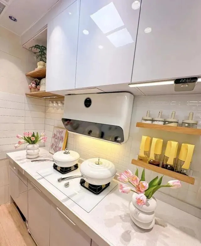 博主直接把柜门、燃气灶、油烟机、水槽 , 全换成白色 , 一个色系打底 , 视觉上就很清爽 , 不会显得挤。
