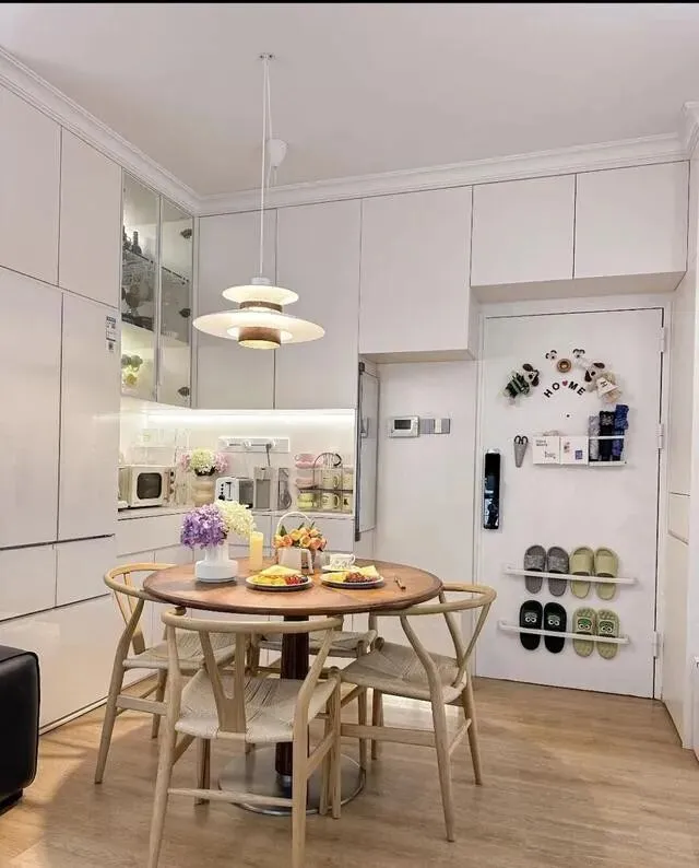 大门背面装置物架挂拖鞋 , 垂直空间用起来了 , 柜子全选白色 , 天花没做复杂吊顶 , 就做了个双眼皮造型 , 简单又不压层高。