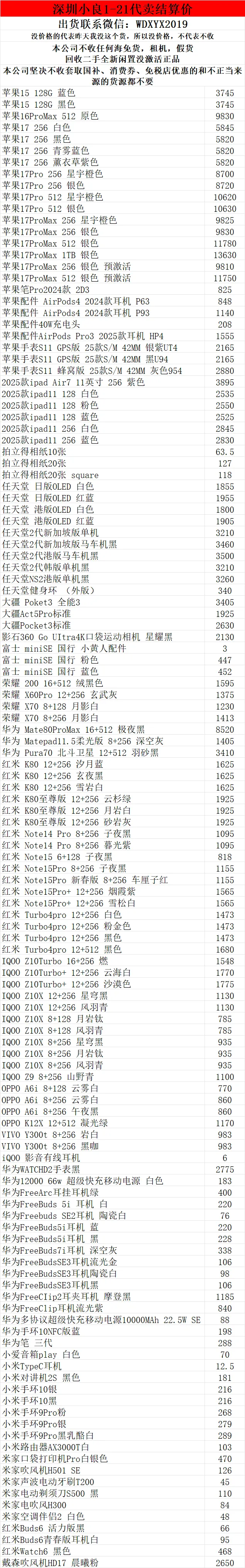 >深圳小良2026.1.21电子产品代卖结算价(美妆价格小程序查看)