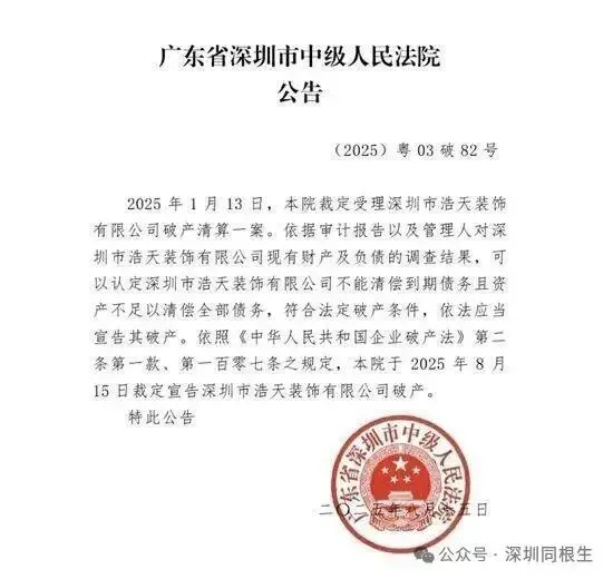 宝子们,近日重磅消息来啦!据浩天装饰集团官方微信公众号以及南方+报道,广东省深圳市中级人民法院发布了(2025)粤03破82号公告,正式宣告深圳市浩天装饰有限公司破产。曾经在装饰行业颇具影响力的浩天装饰,如今无奈走到了经营终点。后续该公司破产清算等相关事宜究竟会怎样推进,我们也会持续保持关注,为大家带来最新动态。