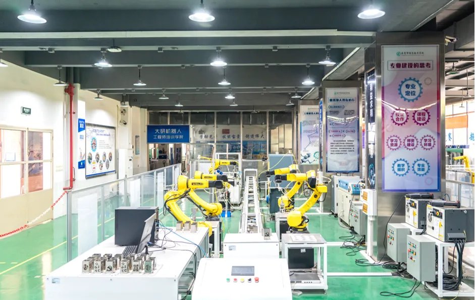 四、实习实训:配备了专门的工业机器人实训室、工业机器人应用编程一体化实训室、配有多种类机器人教学设备以及功能性产线、模块,包括:ABB机器人、KUKA机器人、发那科机器人、自动化流水生产线、模块化拆装机器人、大研机器人、PCB异形插件工作站等,合作企业包括东莞市大研自动化设备有限公司、东莞市辉胜自动化有限责任公司等,并成立了大研现场工程师班,学生可以在机器人制造企业、自动化生产线、研发中心等不同单位进行实习。通过实习实训,学生不仅能够提升自己的专业技能,还能够增强就业竞争力,为未来的职业生涯打下坚实的基础。