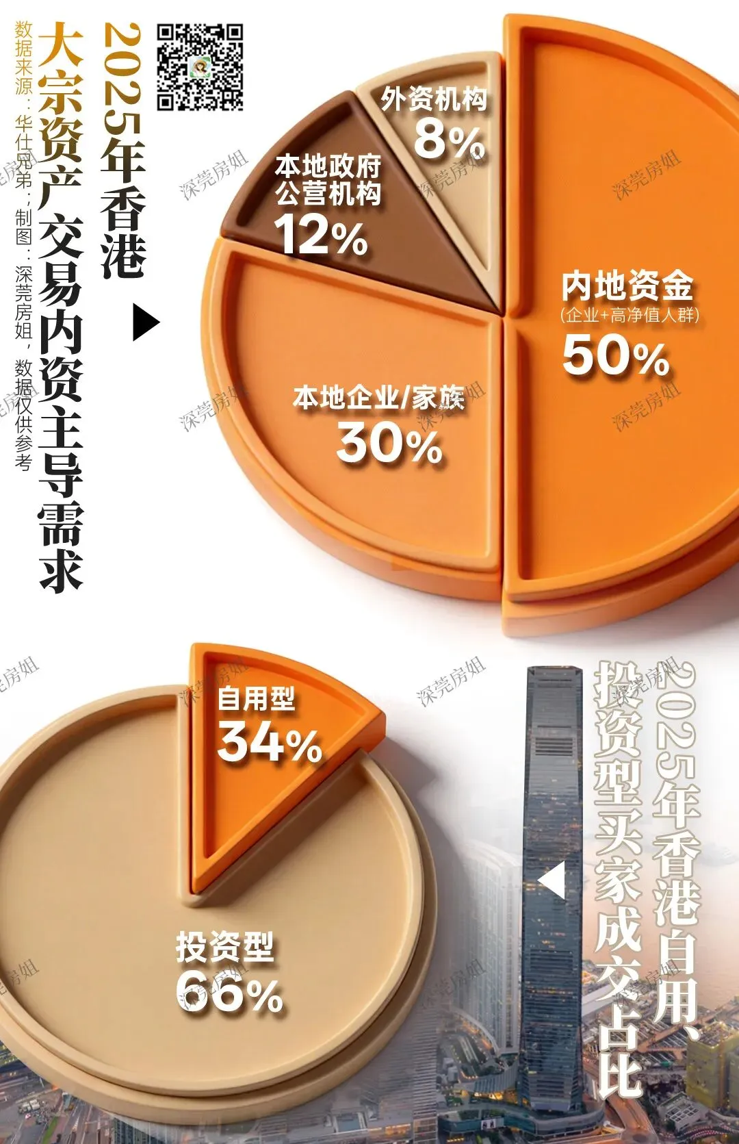 一方面,内地的科技和金融企业,积极地购置写字楼在香港设立区域总部,自用型买家占比从传统不足约20%升至34%。另一方面,大额交易主导市场。10亿港元以上大额交易总额占比约60%,5亿港元以下中小额交易占比下降。有没有感受到,这跟我们对香港楼市的体感,极为吻合呢?