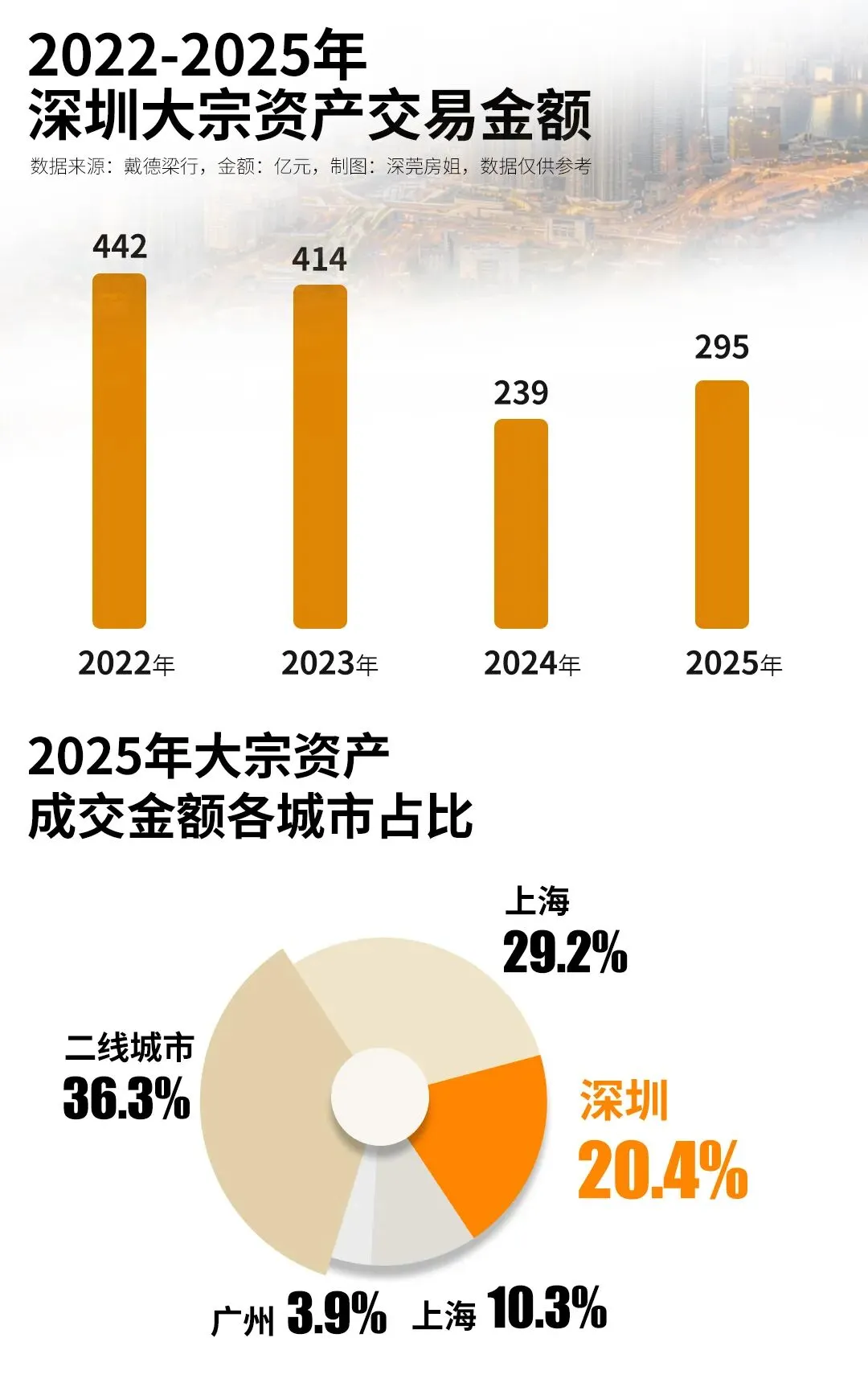 深圳大宗资产交易约295亿厂房工业园法拍火热最后来看最会“搞钱”的深圳。根据戴德梁行统计,2025年深圳大宗资产交易约295亿元,占比全国约20%,成交额强势霸榜内地第二把交椅。数据背后玩味的则是资产分化格局:最受欢迎的是工业厂房法拍、核心商业资产交易,而非核心区域写字楼持续承压,不同业态走出截然不同的行情曲线。