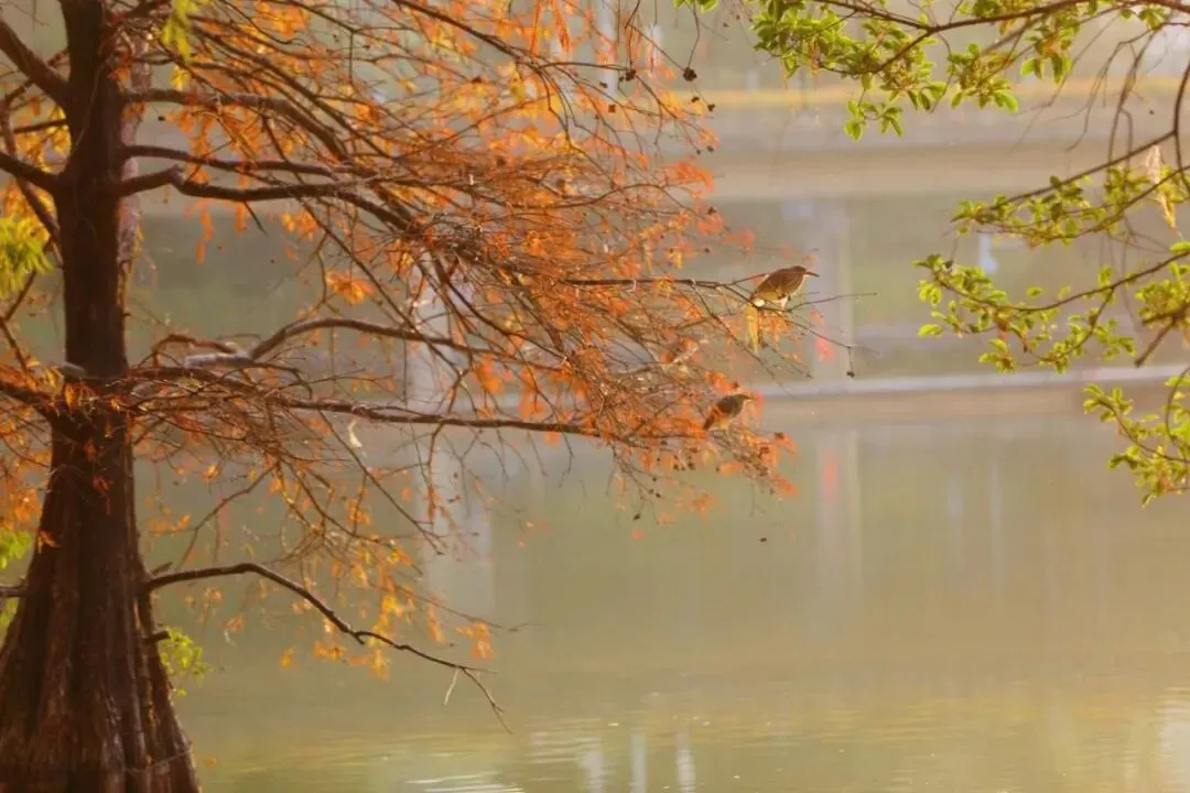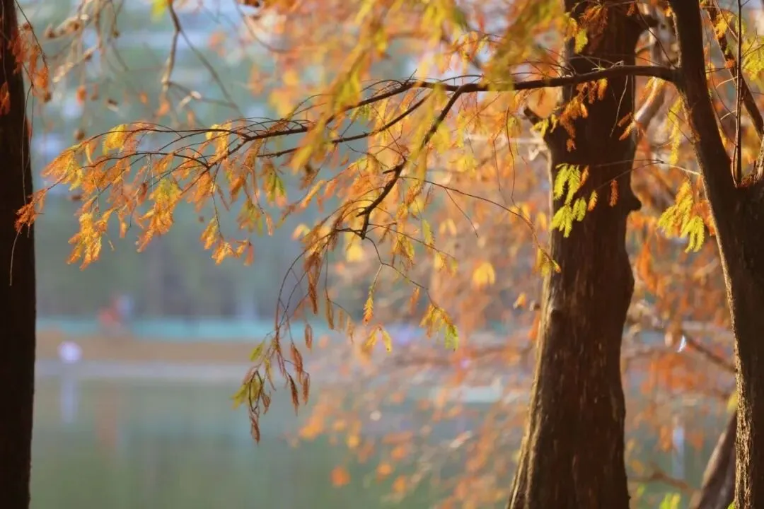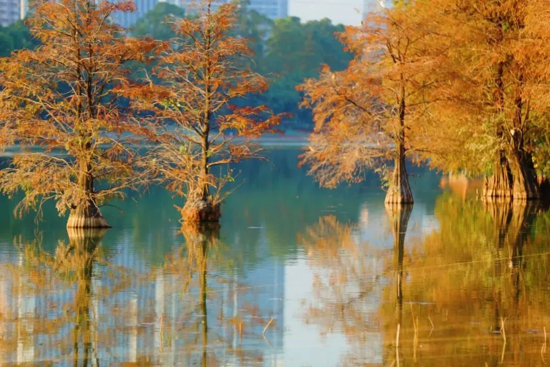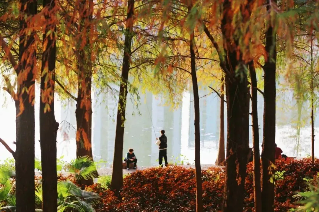 莲花山公园的落羽杉,沿着漾日湖湖畔的木质栈道两旁整齐排列,翠绿、金黄、深红交织,以城市中心的高楼大厦为背景,是节假日年轻人打卡的热点之地,充满活力与烟火气。