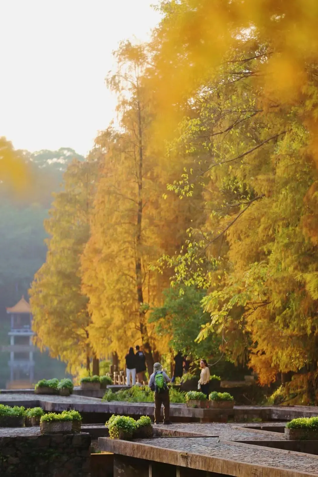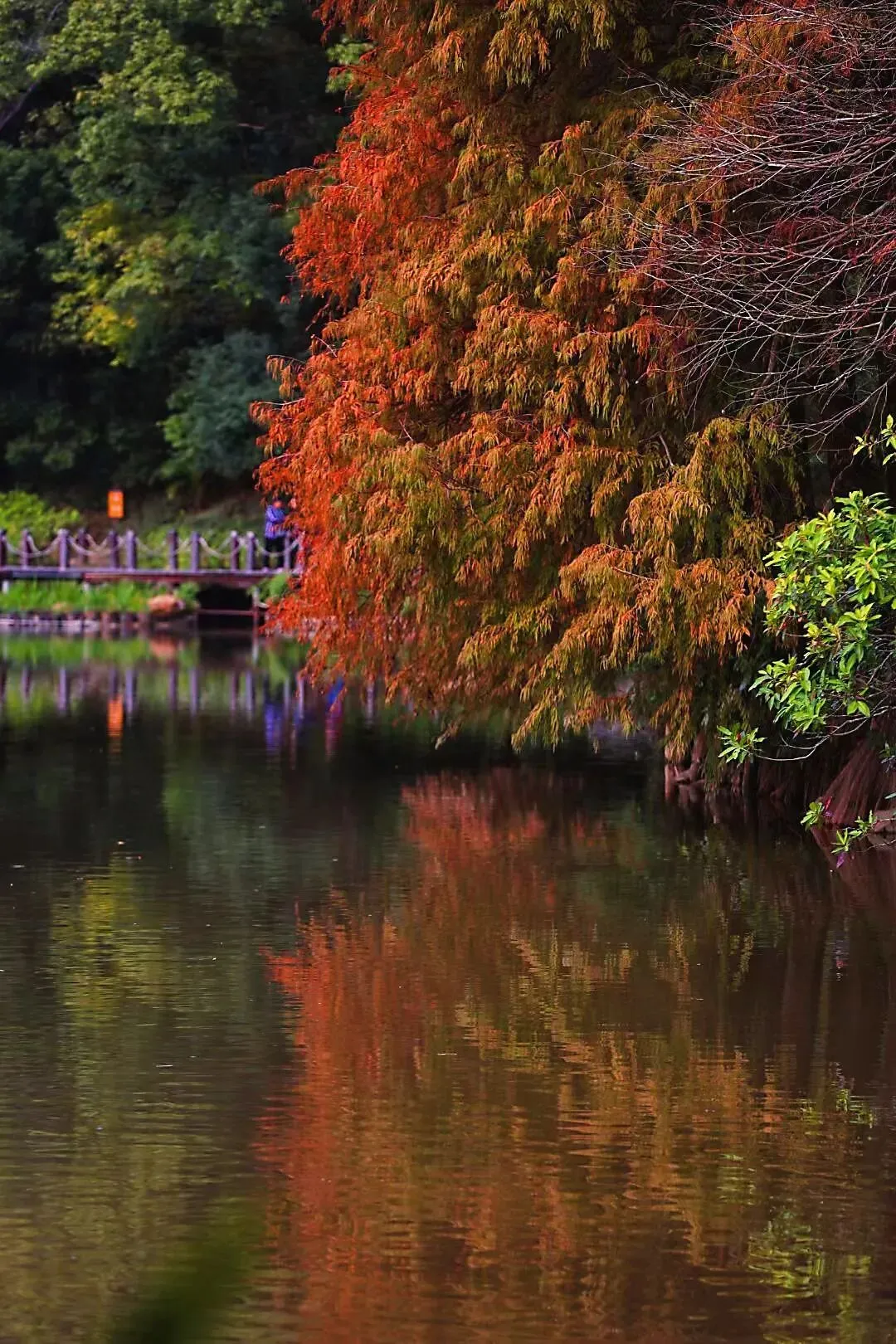 如果还要推荐,那就是仙湖公园,这里的落羽杉沿湖栈道整齐排列,湖光山色,与桥亭楼阁相映,色彩缤纷,宛如油画。