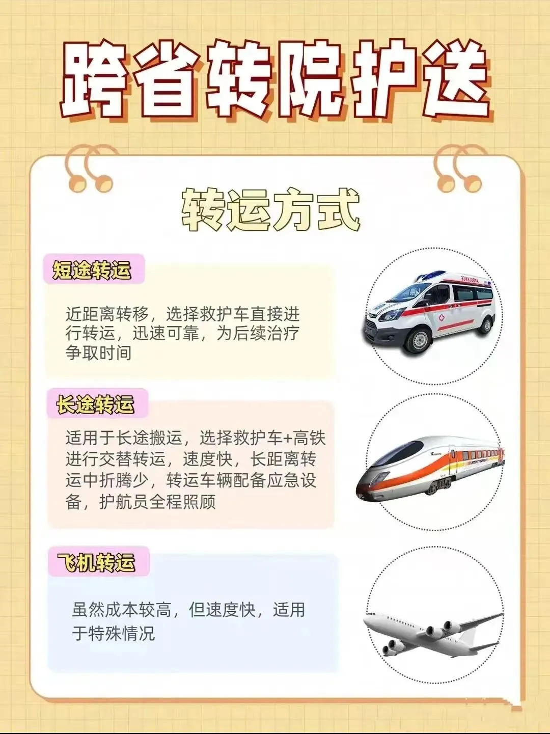 从新生儿到高龄老人,从市内短途接送至跨省长途护送,我们正规非急救转运实现全人群、全场景定制化服务覆盖!无论你有何种转运需求,我们都能精准匹配方案:危重患者转运配备移动ICU设备与特级监护医护,实时应对突发状况;新生儿/早产儿转运采用专属恒温舱,儿科专科医护全程陪护,严控车内温湿度与无菌环境;骨折/术后患者享有术前专业固定+途中体位护理,规避二次损伤。