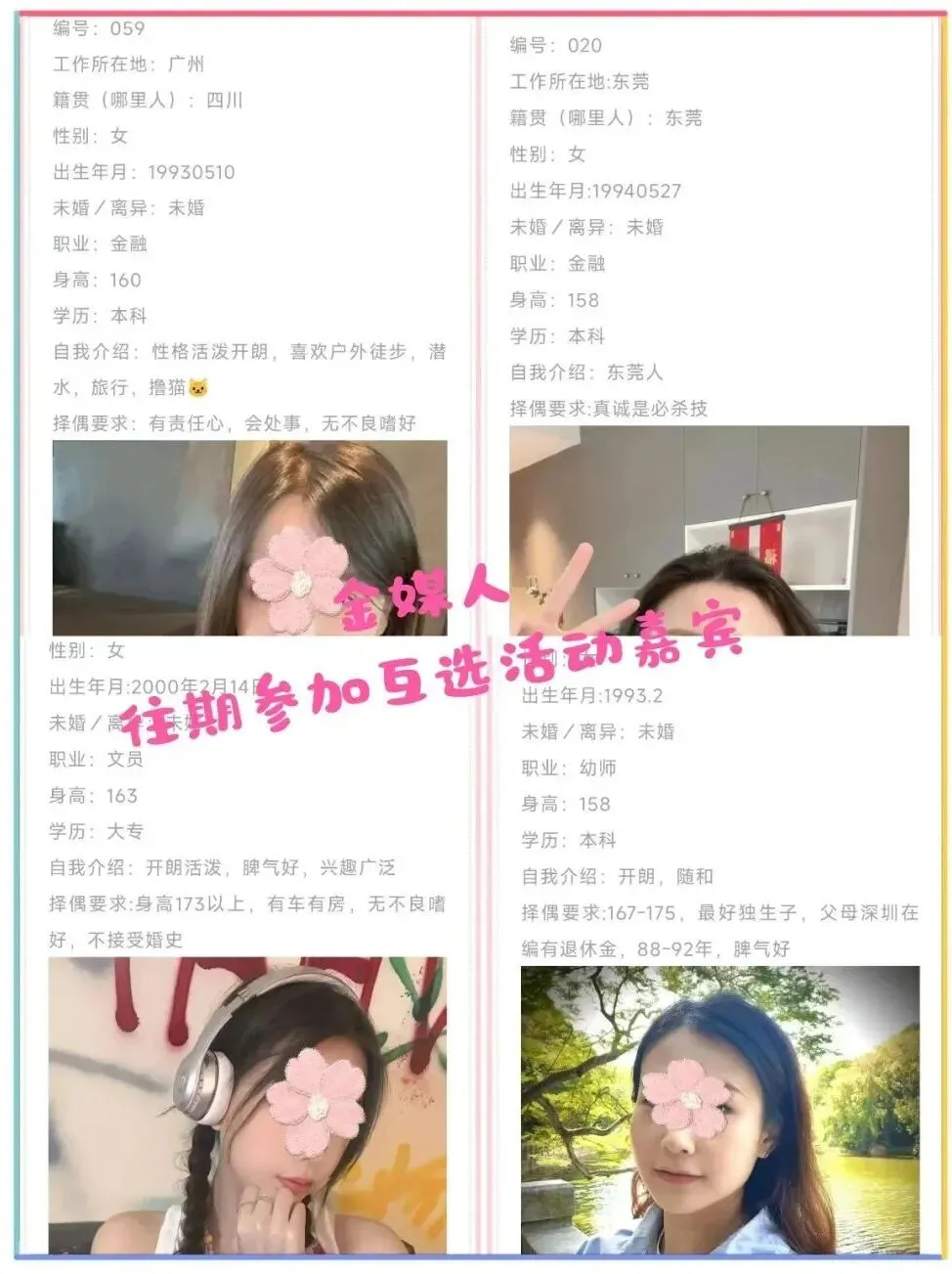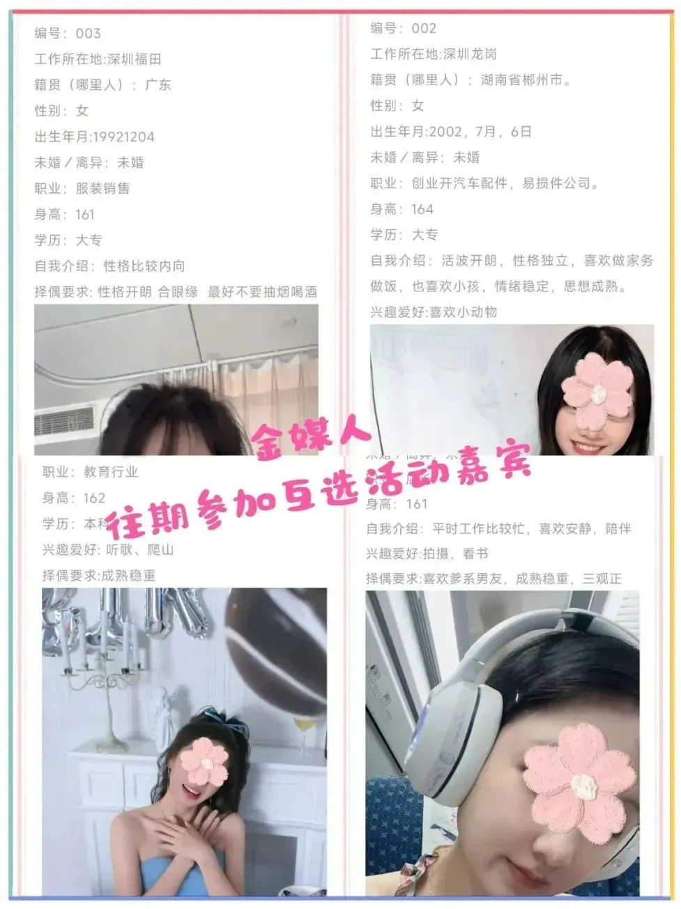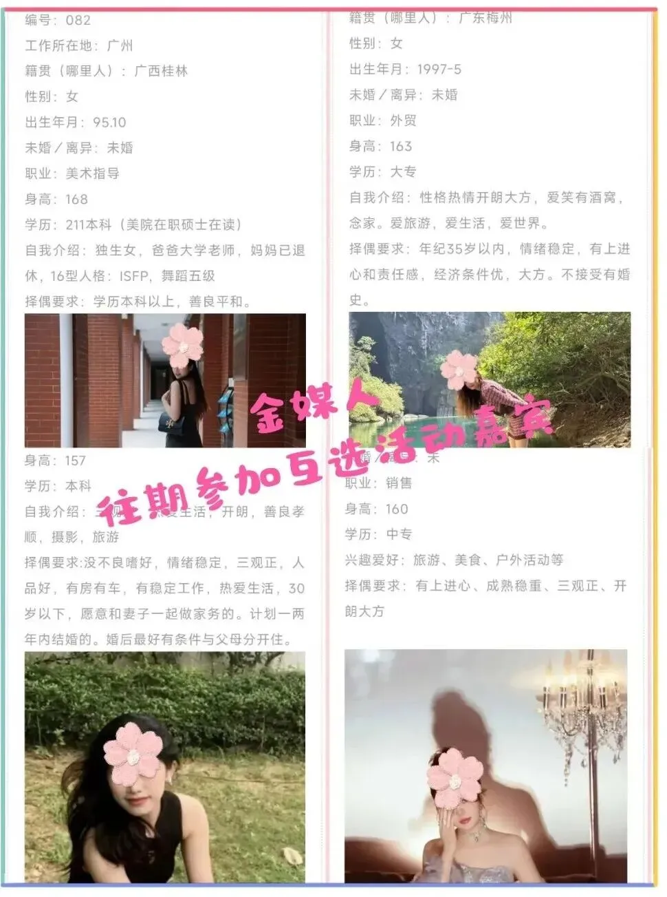 2、关于嘉宾资料真实性,我们只是形式审核基本资料,具体的好人、坏人、人品等需要你们自己多了解。建议保持警惕,多接触了解,不要急于付出,不要有金钱往来,交友有风险,后果需自负。