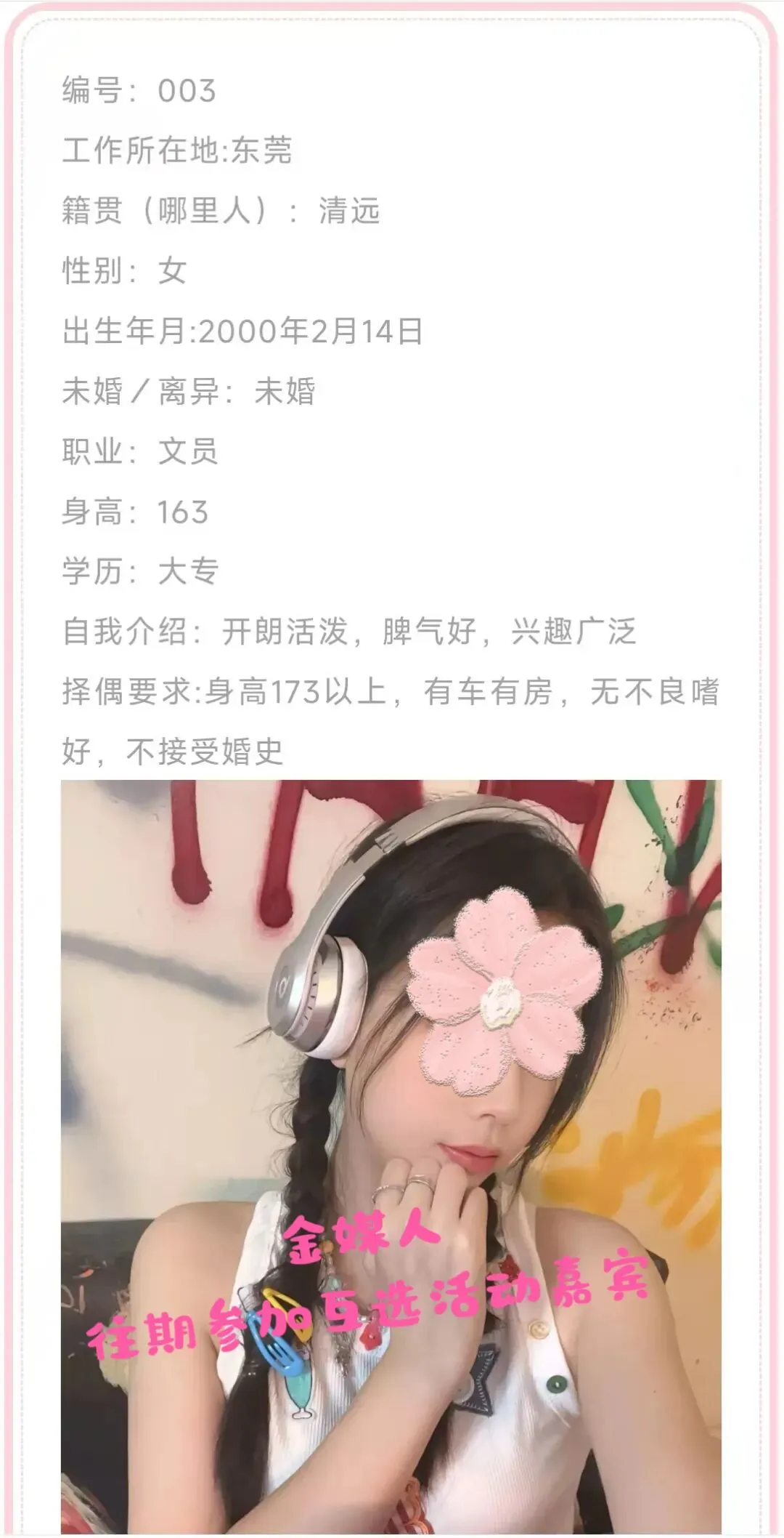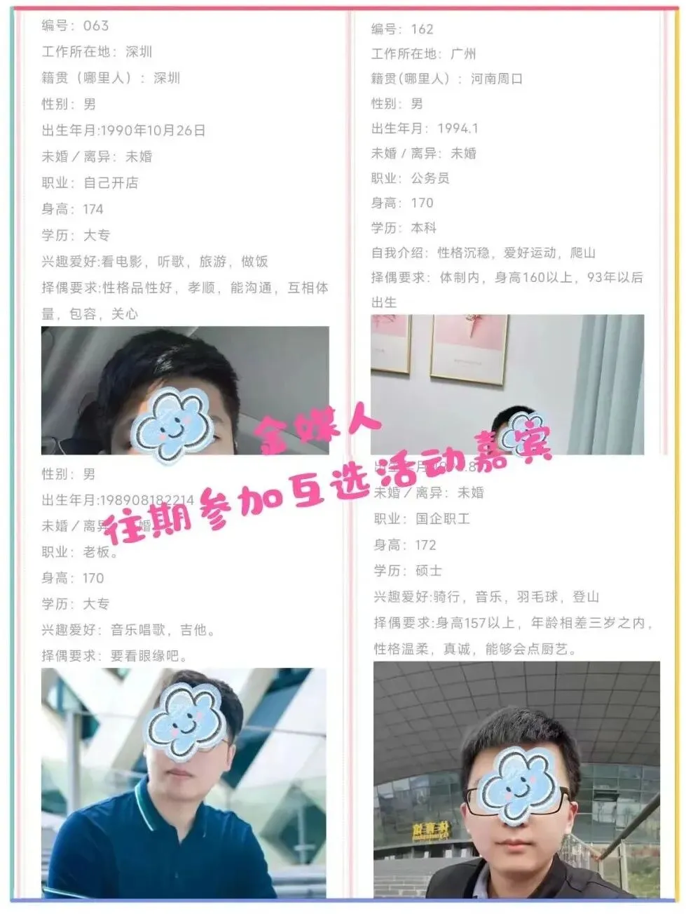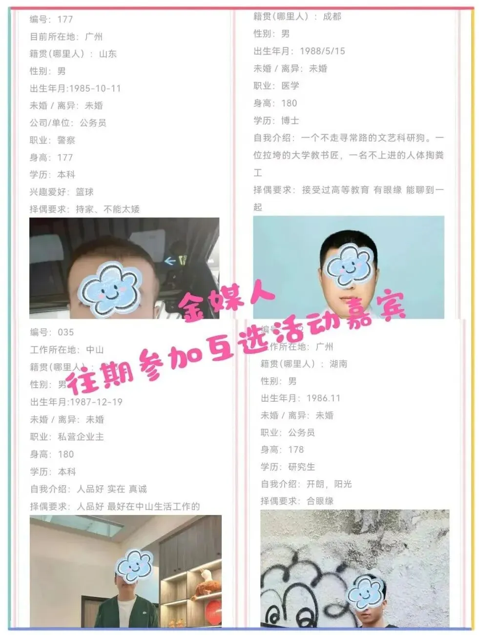 2、关于嘉宾资料真实性,我们只是形式审核基本资料,具体的好人、坏人、人品等需要你们自己多了解。建议保持警惕,多接触了解,不要急于付出,不要有金钱往来,交友有风险,后果需自负。