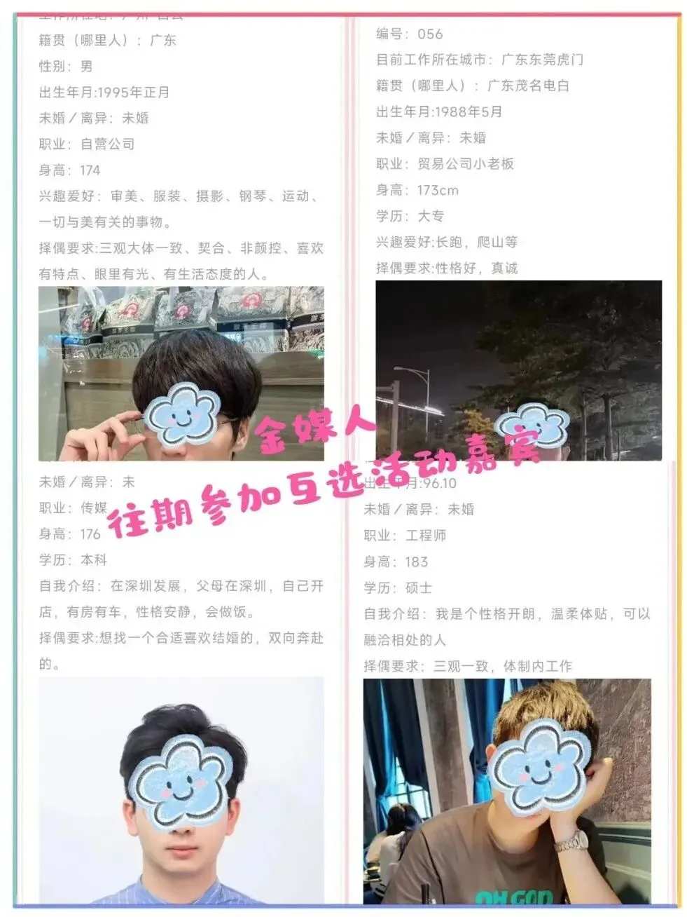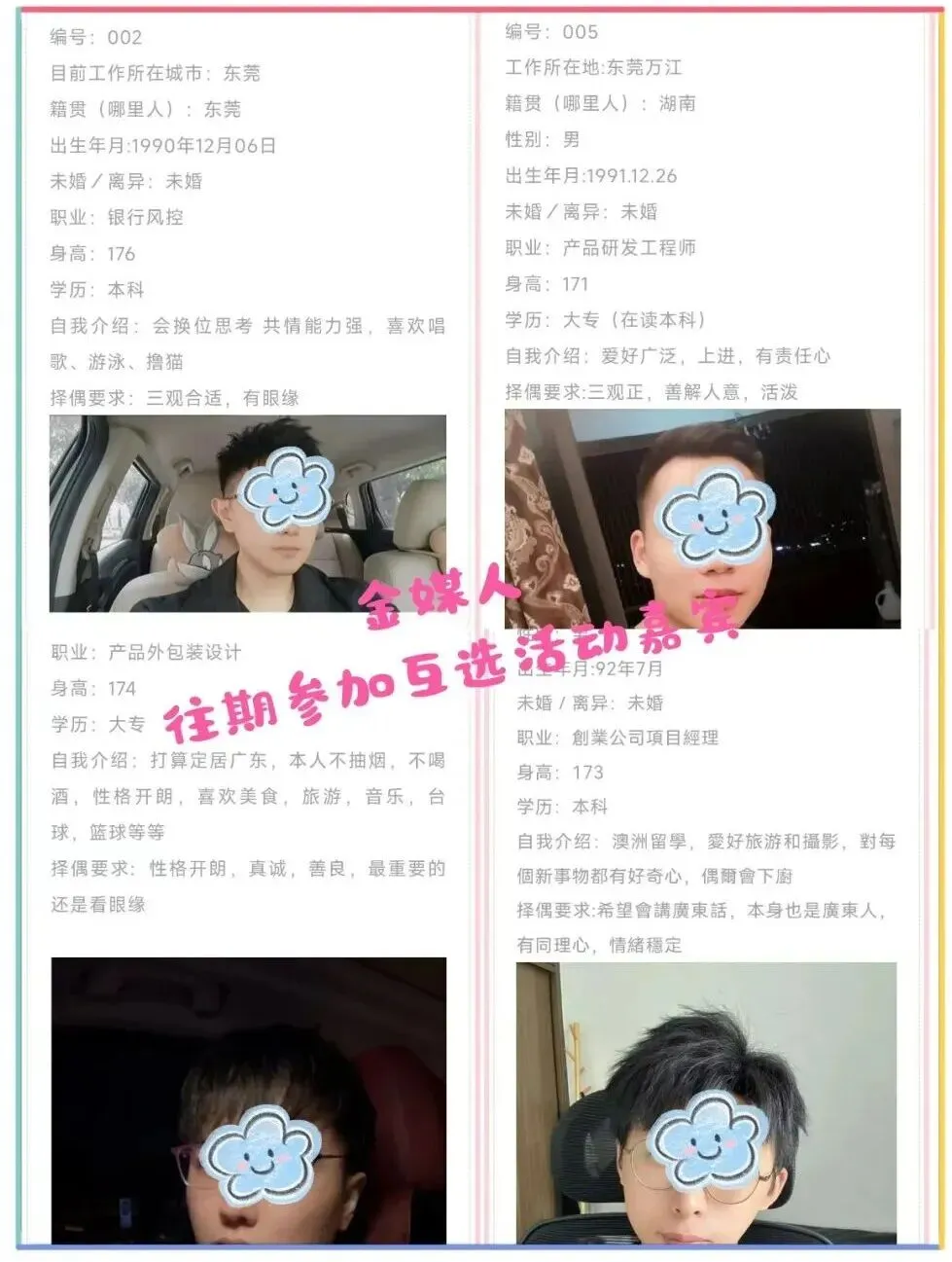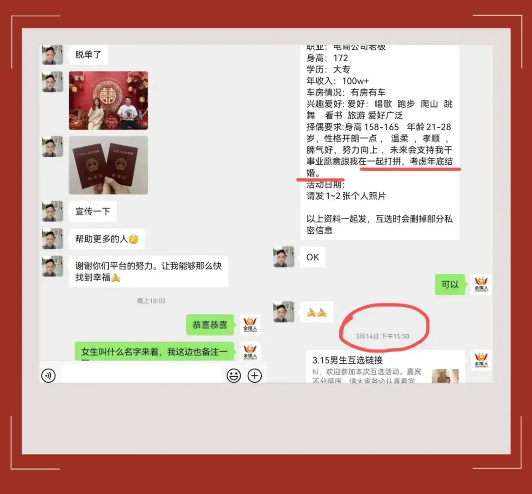 3、相亲是很正能量的事,为杜绝已婚人士/不良人员混入其中产生风险,公司会选择性拍摄照片视频,会不定时大场景直播,所有视频照片均不打马赛克,公布视频、照片可以接受大家的监督,杜绝骗子。一是起到震慑作用,二是用于活动回顾与展现,如果你比较介意,请勿报名参加,参加活动即视为同意,金媒人平台使用。集体活动不存在侵犯肖像权。