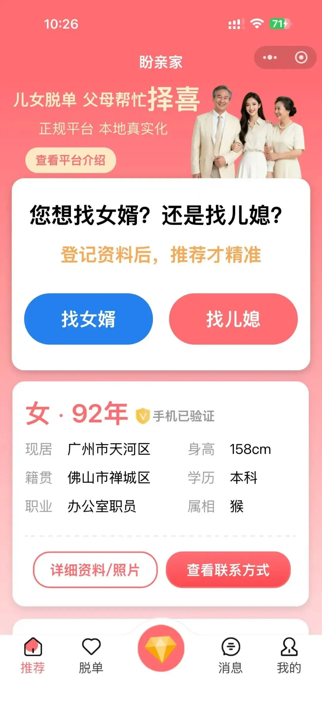 每天都有海量广州佛山本地单身男女入驻「盼亲家」,优质资源持续更新中!不管你是想为自己寻觅良缘,还是帮儿女物色佳偶,这里都能满足你的需求。免费注册、免费推荐、实名保障,让脱单少走弯路,早日遇见命中注定的TA~