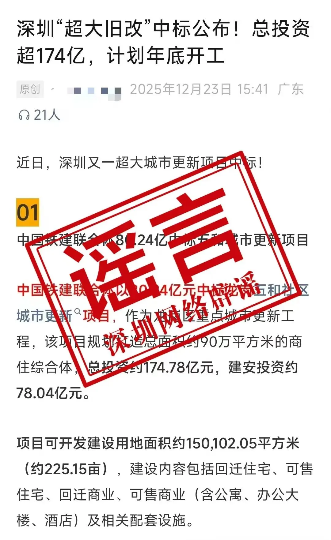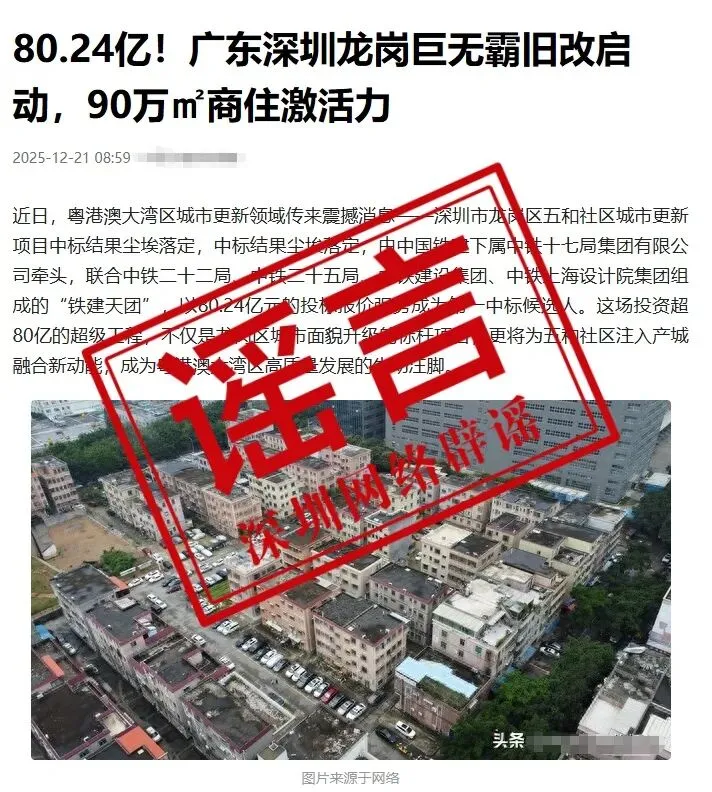 近期,网上流传关于“深圳市龙岗区五和社区城市更新项目招标公告与中标结果”的信息,12月24日,坂田街道发布澄清声明称,经核实,该招标公告及中标结果均为不实信息。近期,网上流传关于“深圳市龙岗区五和社区城市更新项目招标公告与中标结果”的信息。经核实,该招标公告及中标结果均为不实信息,坂田街道五和社区目前并无城市更新项目开展相关招标工作。请广大市民和社会各界不造谣、不信谣、不传谣。对编造、散布此类虚假信息并造成不良社会影响的单位和个人,我街道办将提请有关部门依法追究其相应法律责任。特此声明。坂田街道办事处2025年12月24日