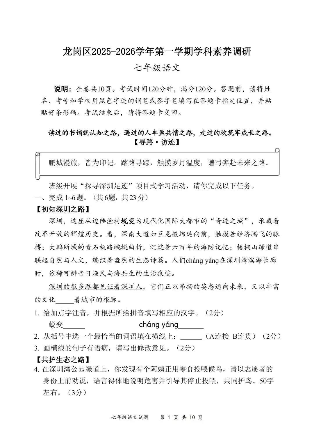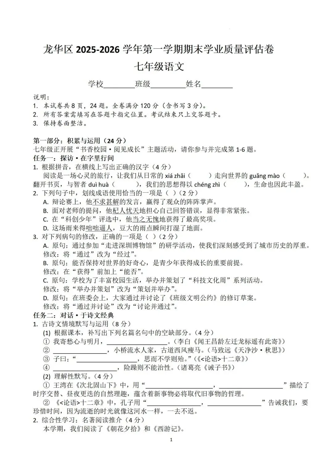 深圳市龙岗区2025-2026学年七年级上学期期末考试语文试卷