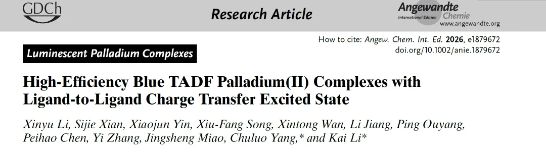 深圳大学材料科学与工程学院李凯教授和杨楚罗教授团队成功开发出一系列基于的高效蓝光钯(II)配合物并表现出优异的TADF特性。该研究成果以"High-Efficiency Blue TADF Palladium(II) Complexes with Ligand-to-Ligand Charge Transfer Excited State"为题发表在国际顶级期刊Angewandte Chemie International Edition上。📊 研究背景