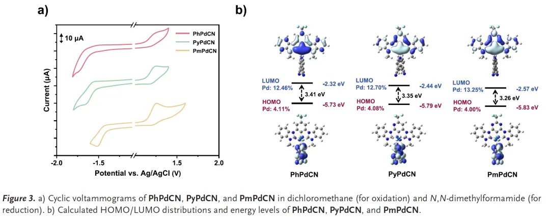 PhPdCN(苯环): 室温下仅显示弱磷光(量子效率1%),³LE态能量过高(2.77 eV)PyPdCN(吡啶环): 实现高效蓝光TADF发射(λem=472 nm, Φ=86%),³LE能量适中(2.82 eV)PmPdCN(嘧啶环): 天蓝色TADF发射(λem=488 nm, Φ=76%),³LE能量最低(2.77 eV)通过电化学和理论计算证实,氧化和还原过程主要由配体控制,金属对HOMO和LUMO的贡献仅为4%-13%,实现了真正的"配体主导"激发态特性。