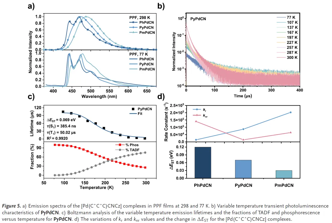 通过77-300 K范围的变温瞬态光致发光测试,团队确认了TADF机制,并通过玻尔兹曼方程拟合得到的ΔEST值(PyPdCN: 69 meV, PmPdCN: 29 meV)与光谱测定结果高度吻合。