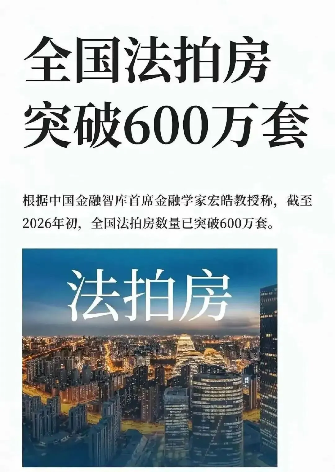2026 年1月,一则数据引发行业震动:中国金融智库首席金融学家宏皓教授披露,截至2026 年初,全国法拍房数量已突破 600 万套。这一数字不仅是国内房地产市场的重要里程碑,更在深圳这座以高房价、高流动性著称的城市,激起了对楼市底层逻辑的深度讨论。
