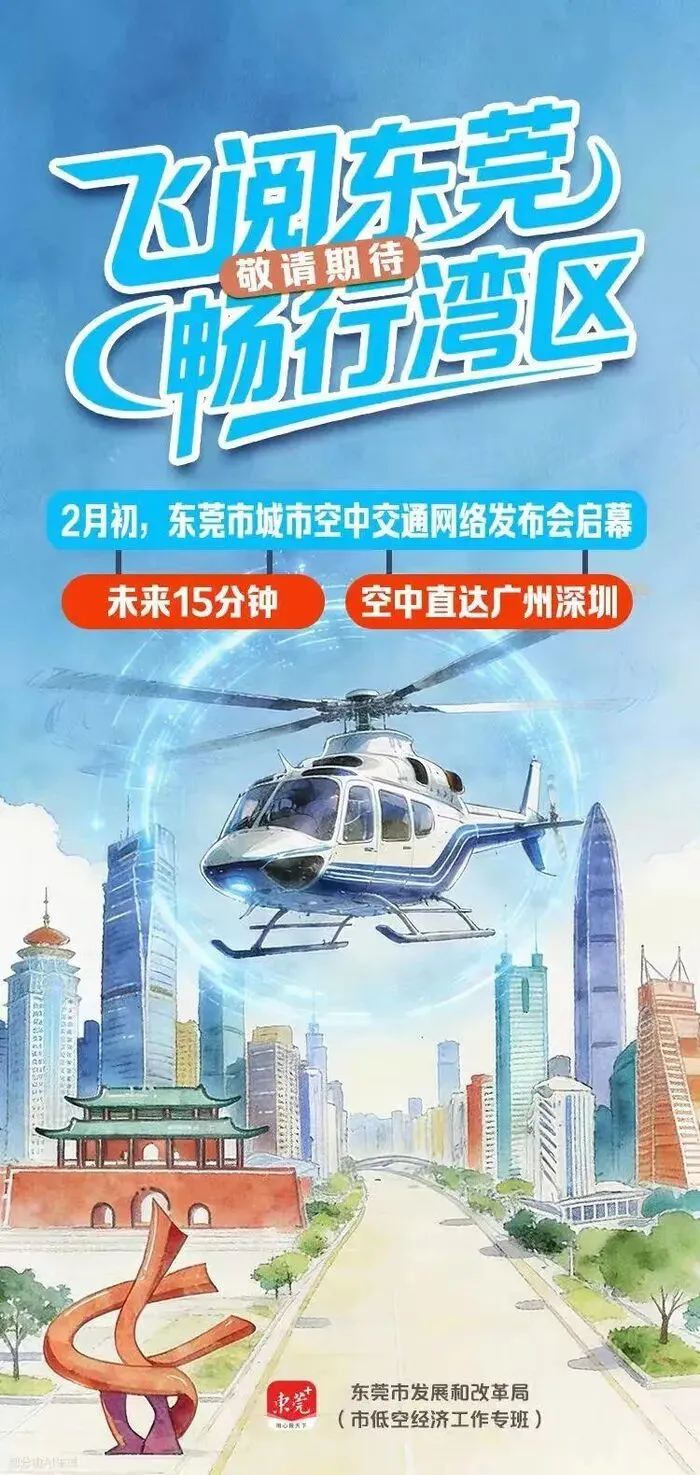 “飞阅东莞,畅行湾区”。这不仅是一次交通方式的革新,更是一次城市能级的跃升。2月初,让我们共同见证东莞在低空经济的赛道上振翅高飞,与湾区兄弟城市携手,共绘低空高质量发展的壮丽蓝图。